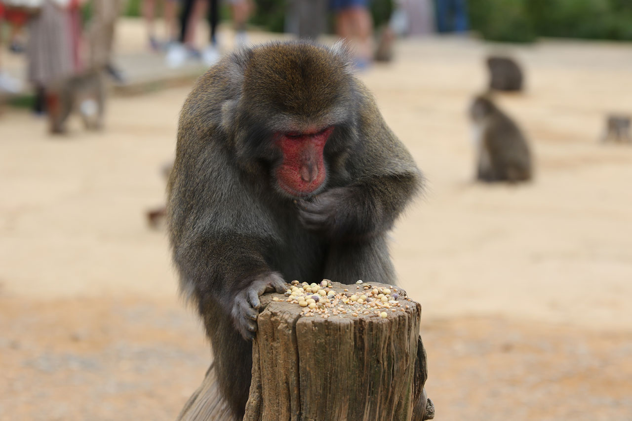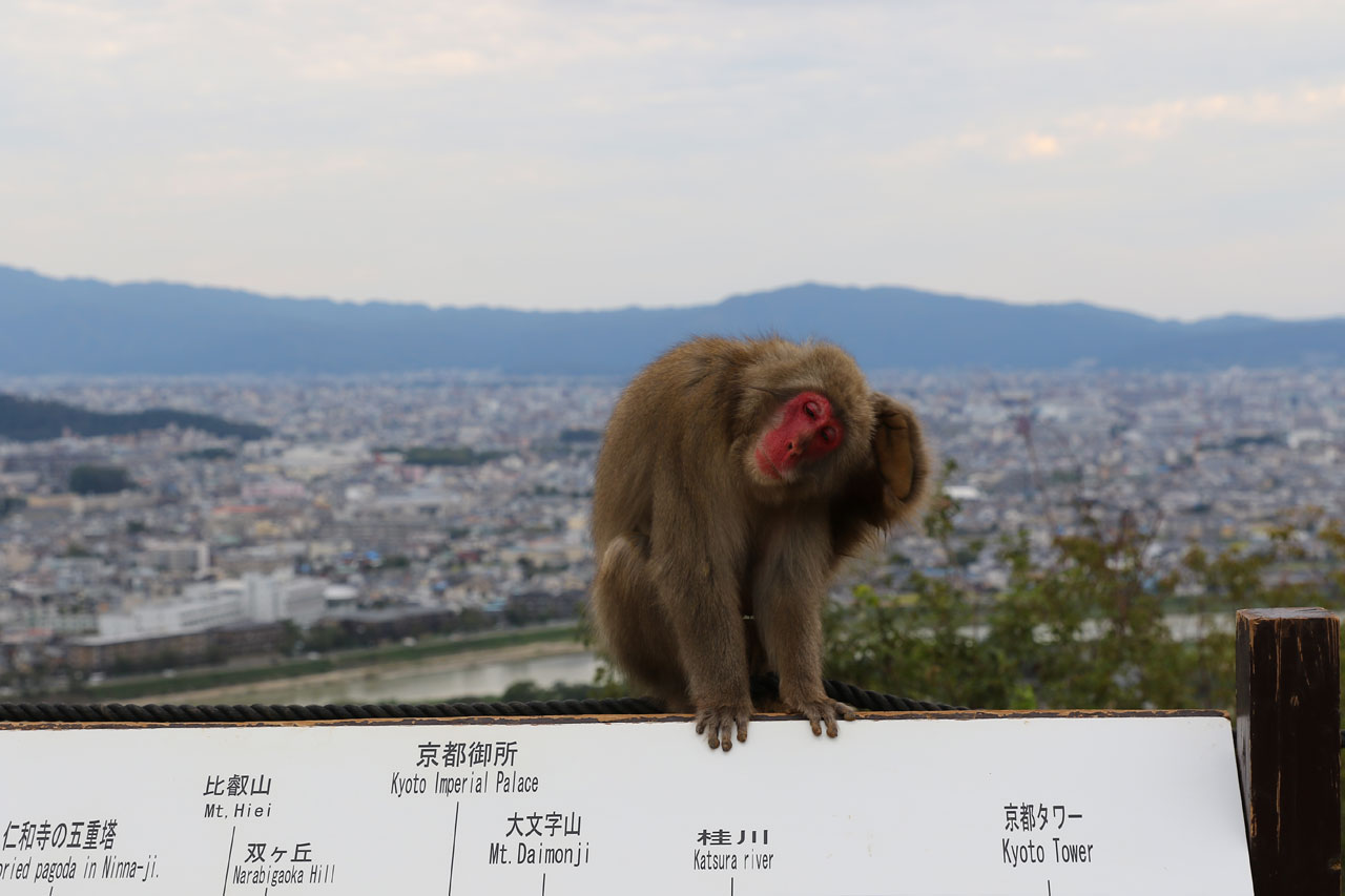 Mais avant de passer par la forêt de bambous, nous sommes allés au Monkey Park. Sur le papier, c’est censé être un endroit où des singes du coin sont en semi libertés dans un grand parc à flan de collines. Dans les faits, c’est 20 minutes de grimpette pour arriver en haut de la dite colline et là… les singes maraudes au milieu des touristes en attendant l’heure de « la grande animation »: le nourrissage. Après un jingle musical se voulant léger et amusant mais qui ne réussi qu’à être embarrassant, les gardiens font mettre les touristes en cercle et passent en jetant de la nourriture aux singes au milieu du cercle pour qu’on puisse les prendre en photo. Comment vous dire à quel point le côté malsain de la chose nous a dérangé? J’ai vu d’autre gens que cela semblait gêner également. Sans parler du fait que l’endroit faisait un peu miteux et que certains singes semblaient un peu exclu du truc. Seul point positif, la vue sur Kyoto est sublime depuis là-haut. J’aime autant vous dire que nous ne nous sommes pas trop attardés sur place.