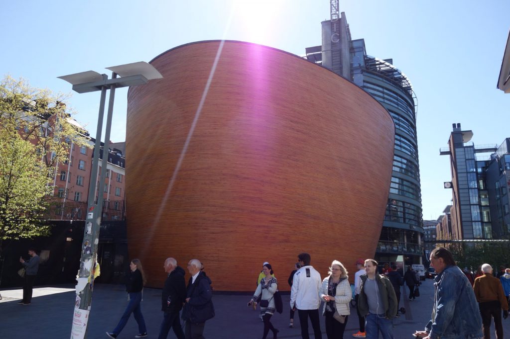 Direction ensuite la chapelle de Kamppi. Curiosité architecturale qui de l’extérieure ressemble à une énorme baignoire en bois posée au milieu d’immeubles modernes. Ca surprend mais ce n’est pas vilain. Pendant qu’Aurélie ira voir dedans je ferai le tour pour tomber sur un type avec maillot de hockey de l’équipe nationale et un masque de renne qui joue du Métal en pleine rue. O K.