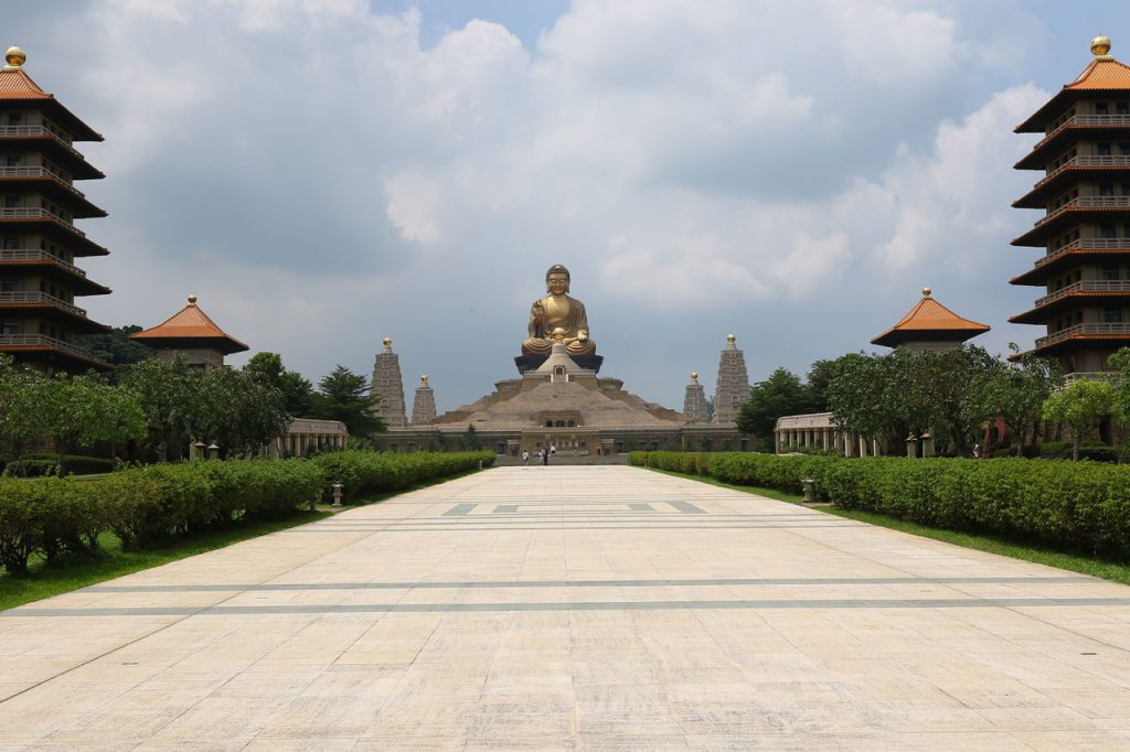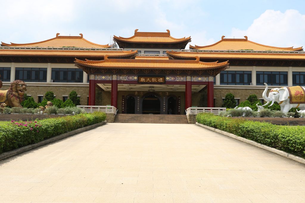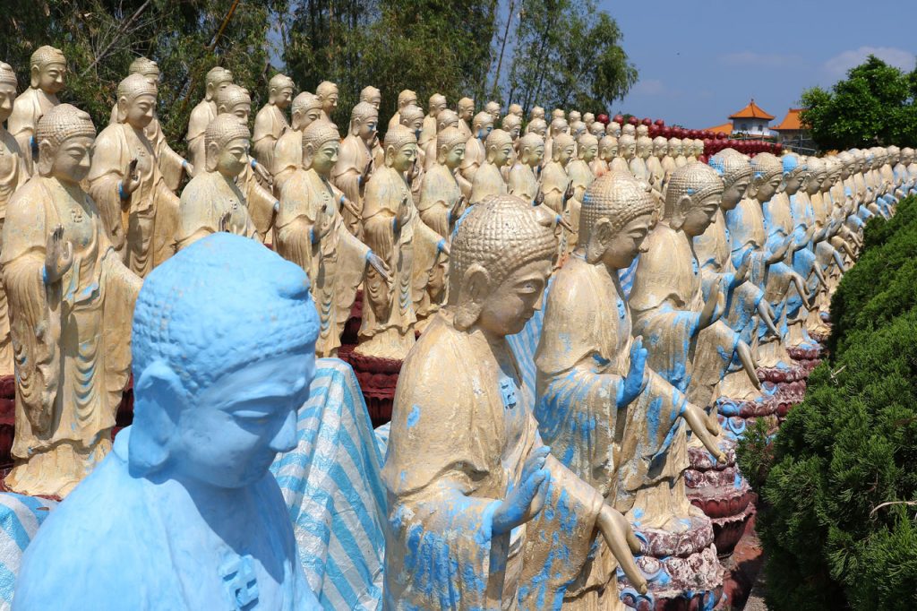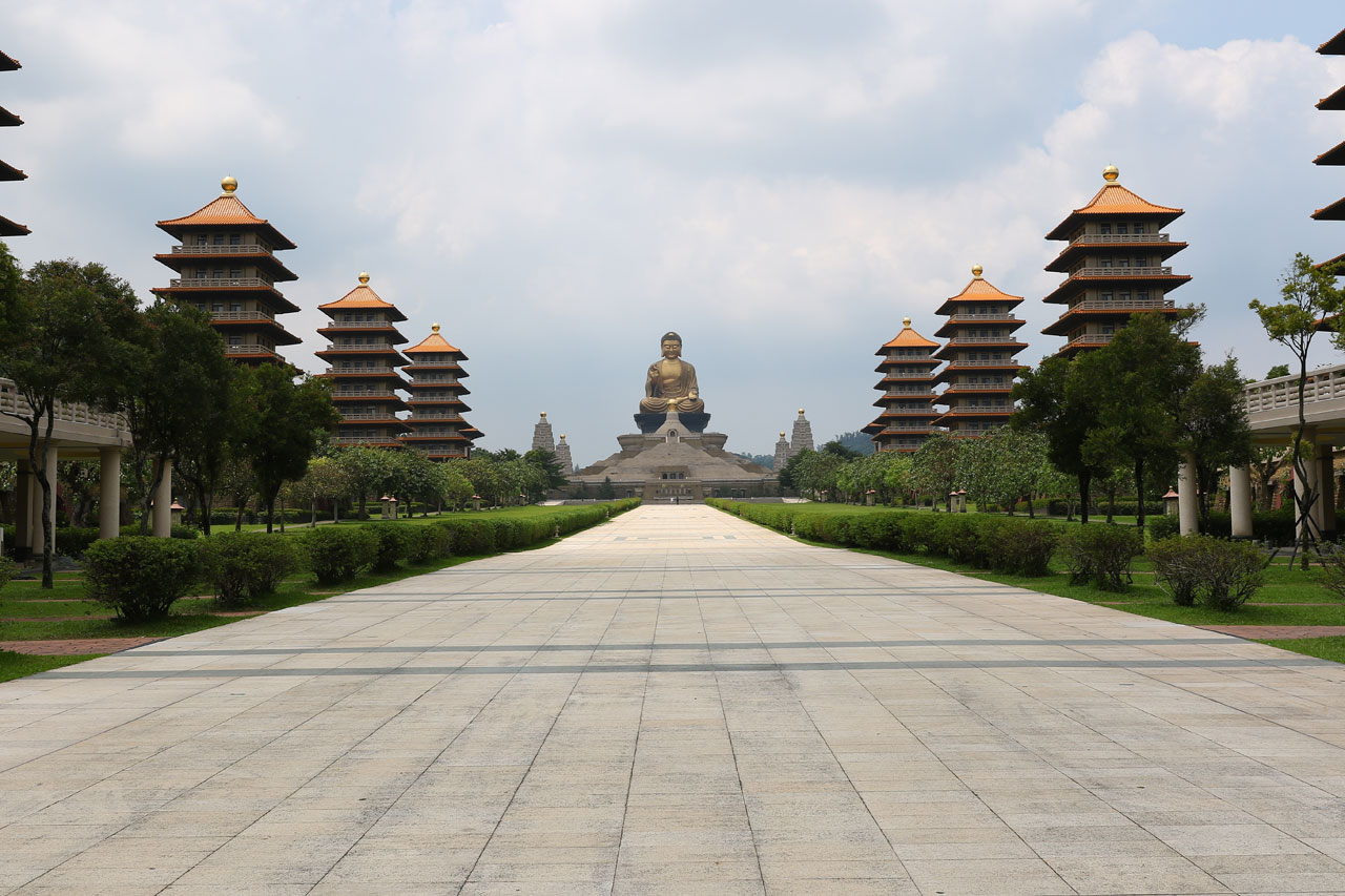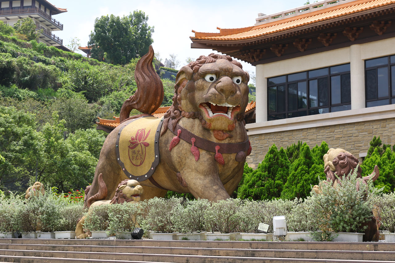 Notre première destination du jour est Fo Guang Shan, un vaste complexe bouddhique construit entre 2003 et 2011 dans lequel sont regroupés un monastère, divers temples et statues ainsi qu’un musée, un centre de conférence et de quoi faire des retraites spirituelles. L’endroit fait 2 fois et demi le Vatican en superficie c’est vous dire la taille du lieu et je ne vous parle pas de la taille des parkings. Parlant de ça, j’ai réussi à garer la voiture à l’ombre, ce qui vu la température du jour est un petit exploit. Ce matin au départ de Tainan, on était déjà largement au delà des 32°. De toute façon, ici la nuit on est rarement sous les 30° et les 75% d’humidité.