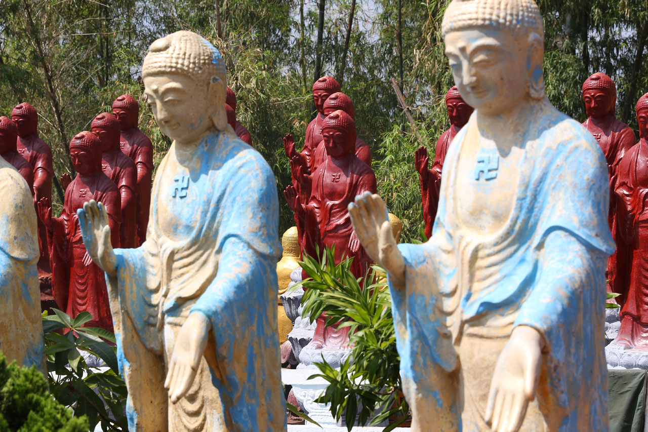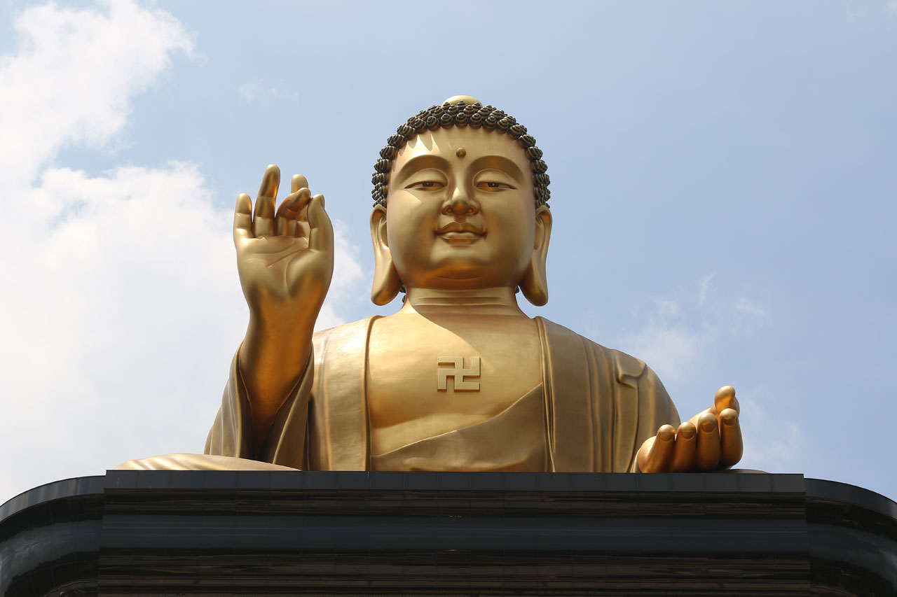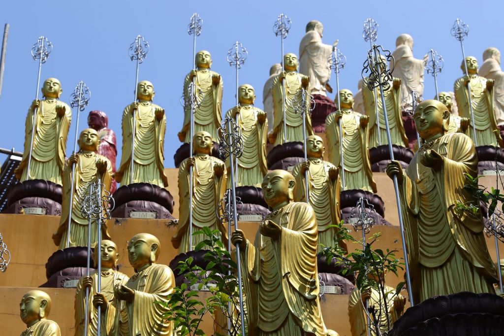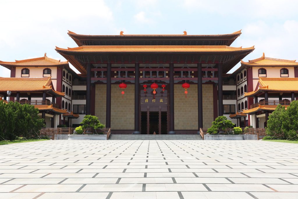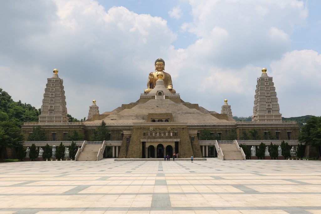 Notre première destination du jour est Fo Guang Shan, un vaste complexe bouddhique construit entre 2003 et 2011 dans lequel sont regroupés un monastère, divers temples et statues ainsi qu’un musée, un centre de conférence et de quoi faire des retraites spirituelles. L’endroit fait 2 fois et demi le Vatican en superficie c’est vous dire la taille du lieu et je ne vous parle pas de la taille des parkings. Parlant de ça, j’ai réussi à garer la voiture à l’ombre, ce qui vu la température du jour est un petit exploit. Ce matin au départ de Tainan, on était déjà largement au delà des 32°. De toute façon, ici la nuit on est rarement sous les 30° et les 75% d’humidité.
