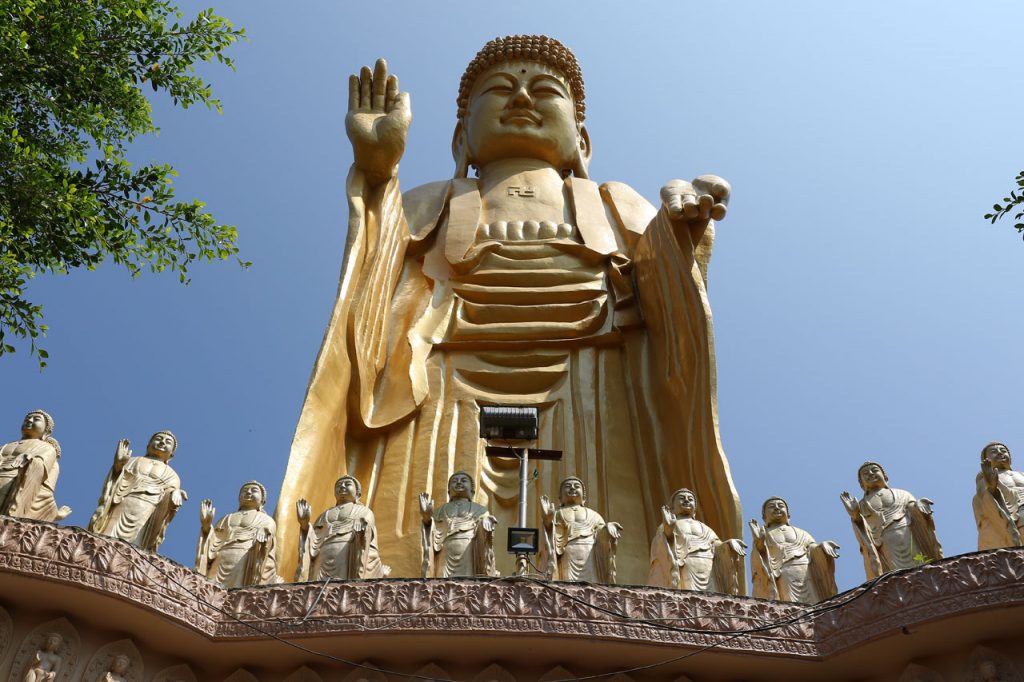 Direction ensuite, le clou de la visite. Le grand centre bouddhique. Un truc totalement démesuré et feng chui qui s’étend sur plusieurs centaines de mètres de long avec pas moins de 8 pagodes (4 de chaque côté), une espèce de pyramide centrale qui abrite le centre de conférence ainsi qu’une relique de Bouddha et bien entendu, une statue colossale qui surplombe tout ça. Pour tout vous dire, en voyant ça je n’ai pas pu m’empêcher de faire une analogie cinématographique. La fin de Permis de tuer, un James Bond de 1989, où 007 se retrouve dans un complexe religieux démesuré. Très étrange sensation de déjà vu.