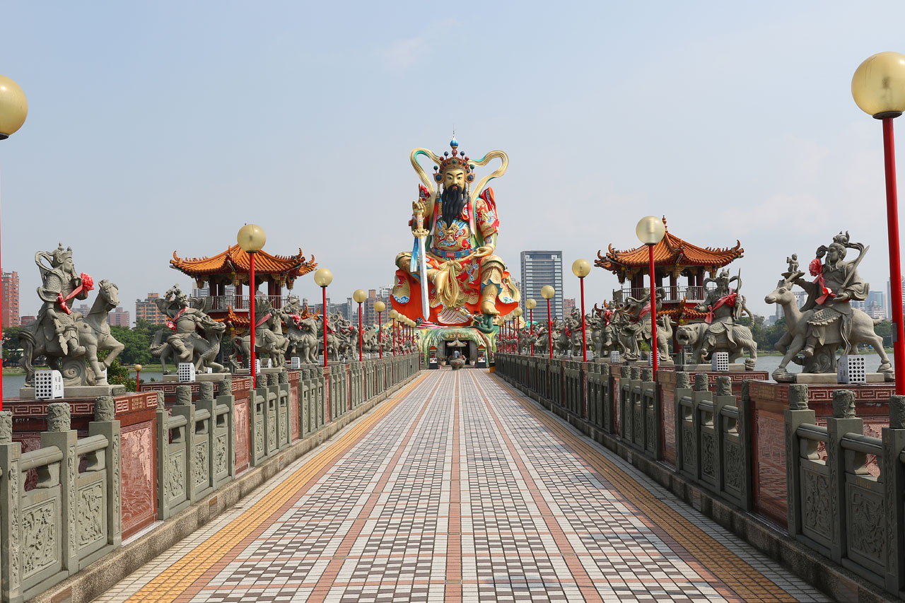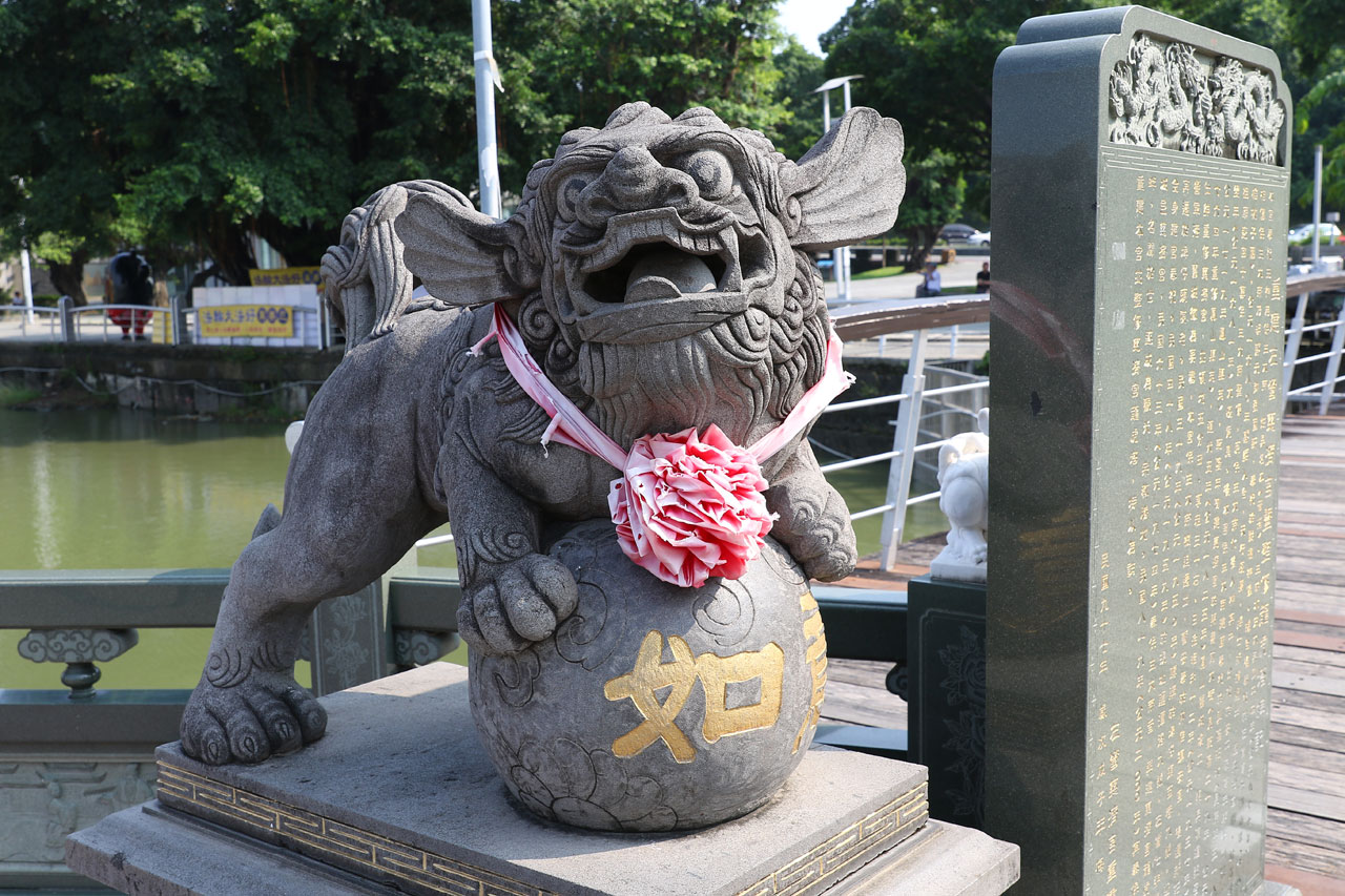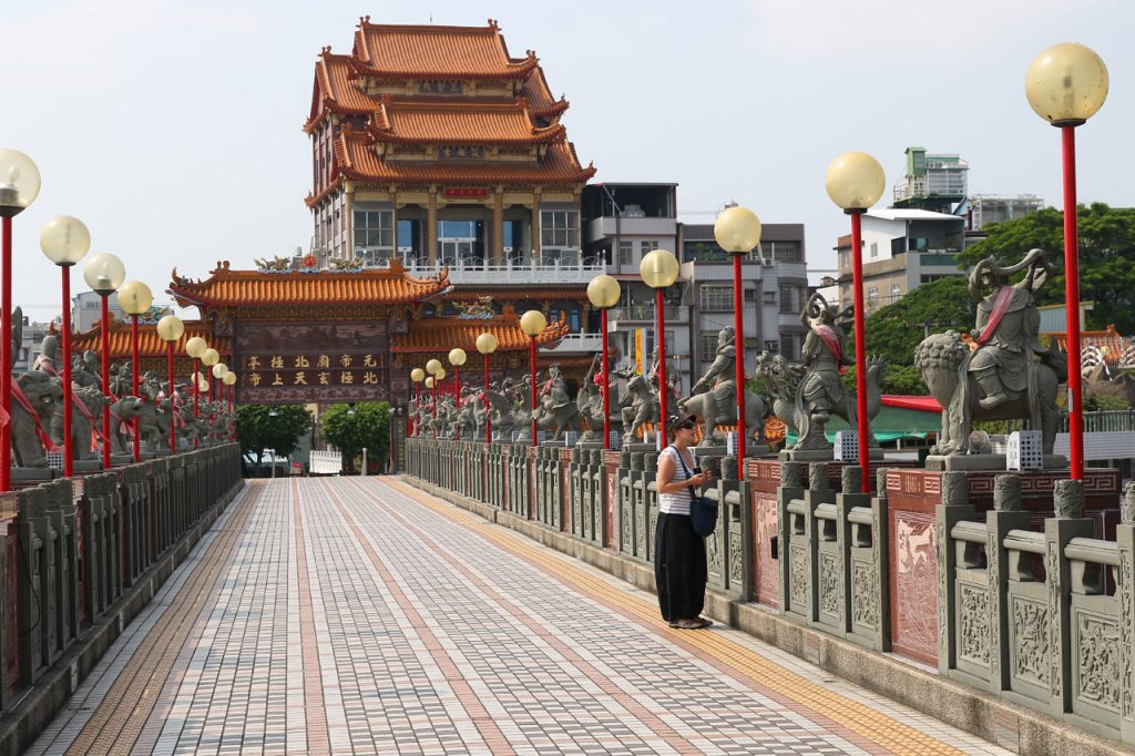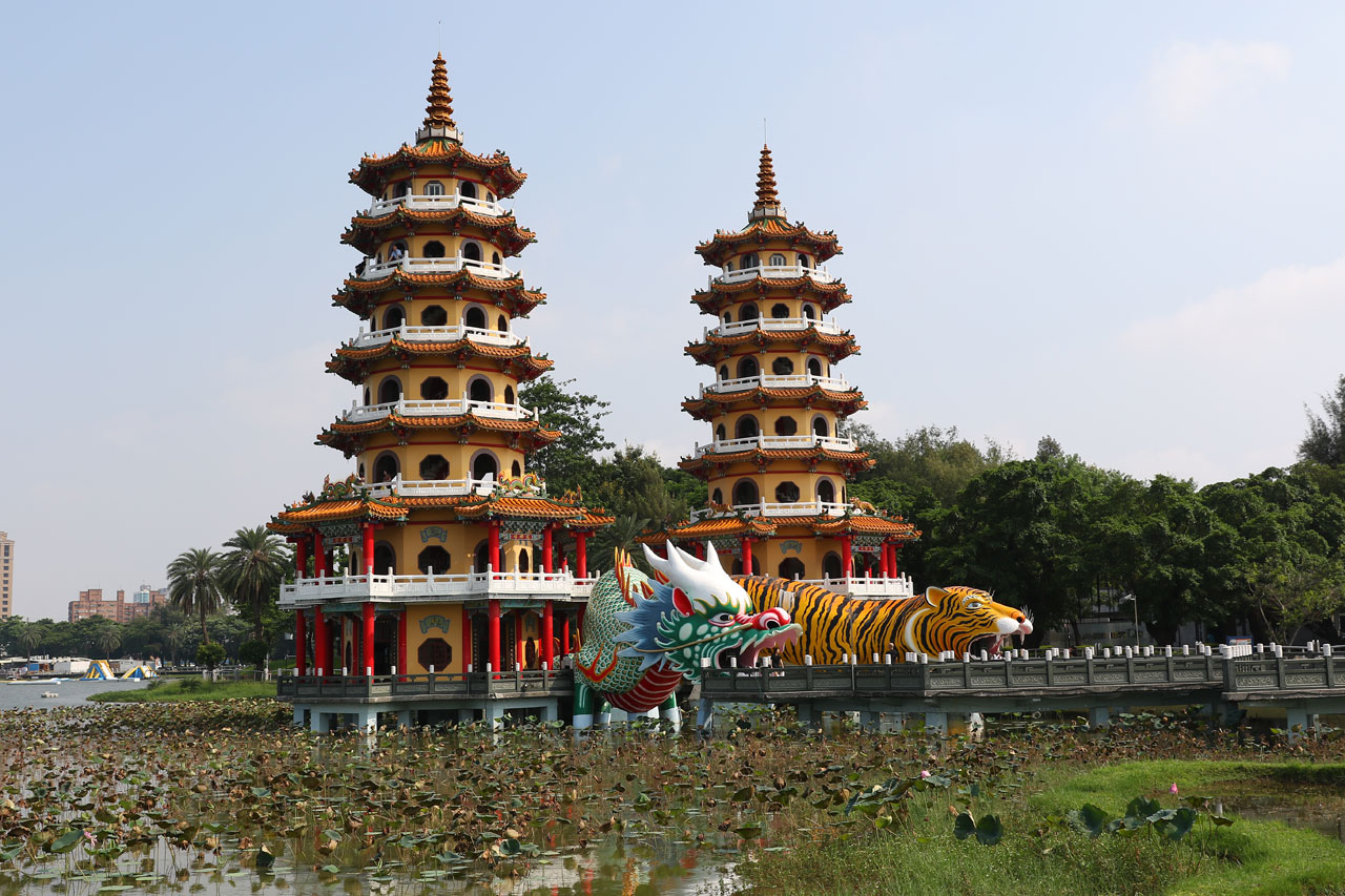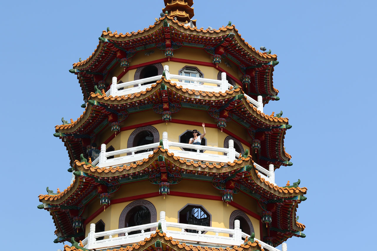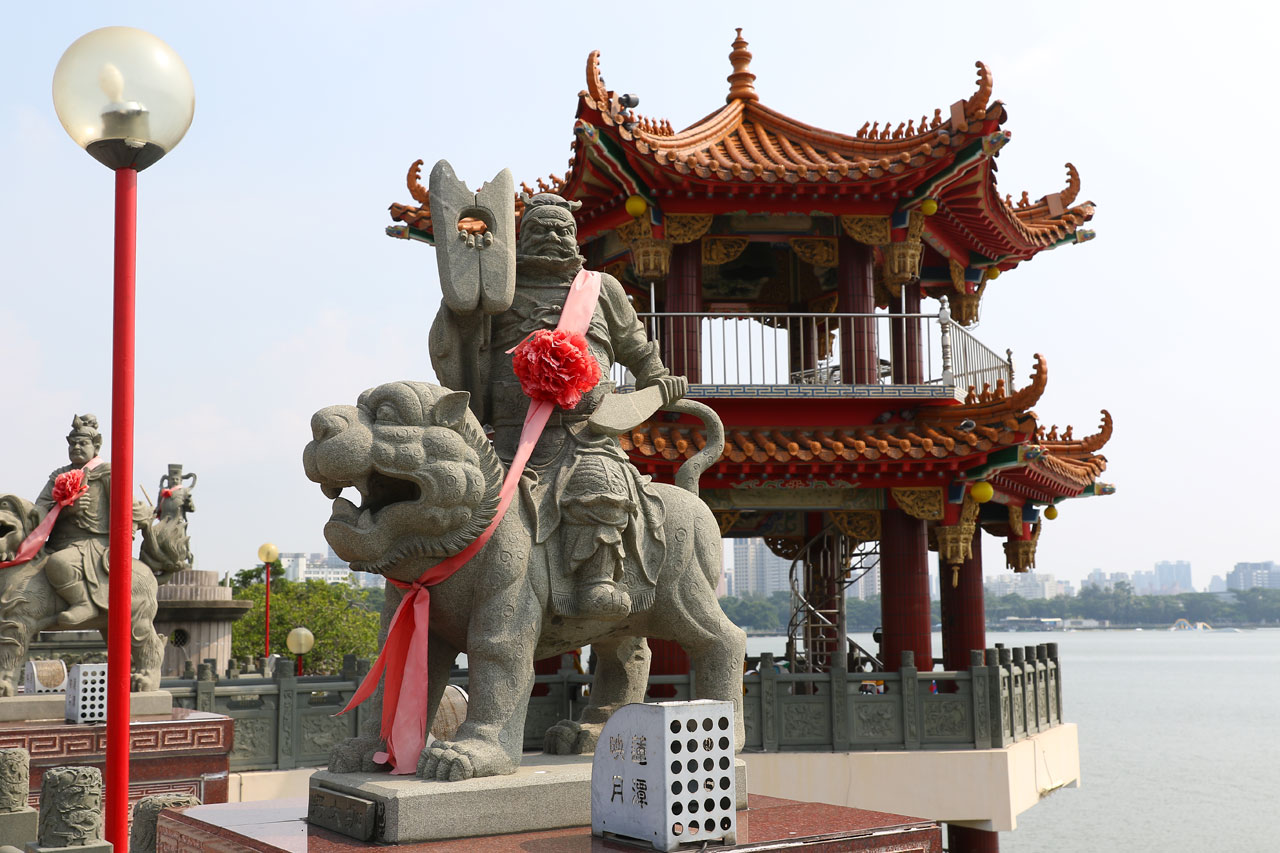 C’est complètement fracassé par la chaleur que nous partons enfin vers Koahsiung. Je vous avoue que j’étais prêt à faire un détour pour rester au frais dans la voiture plus longtemps. Nous arrivons donc dans le nord de ville à la Lotus Pond. Un grand plan d’eau au bord duquel se trouve quelques bricoles à voir. Nous nous mettons en quête d’une place de parking, je me pose le long d’un trottoir dans une place et nous partons sous une chaleur infernale de l’autre côté de la rue au temple de Confucius. Oui parce que chaque ville à la sien, histoire de ne pas faire de jaloux. Celui-là ne casse pas des briques. Les autres choses à voir ne sont qu’à quelques centaines de mètres mais Aurélie abdique et me dit que c’est mort, on y va en voiture. Ok.