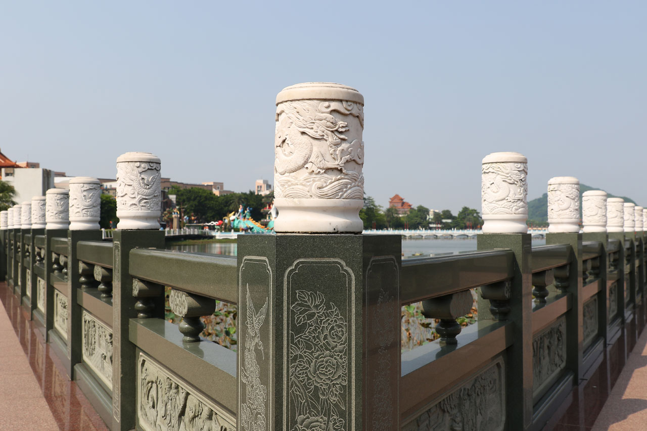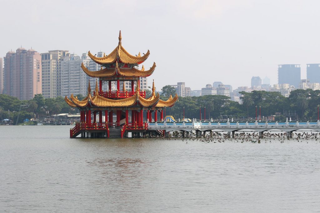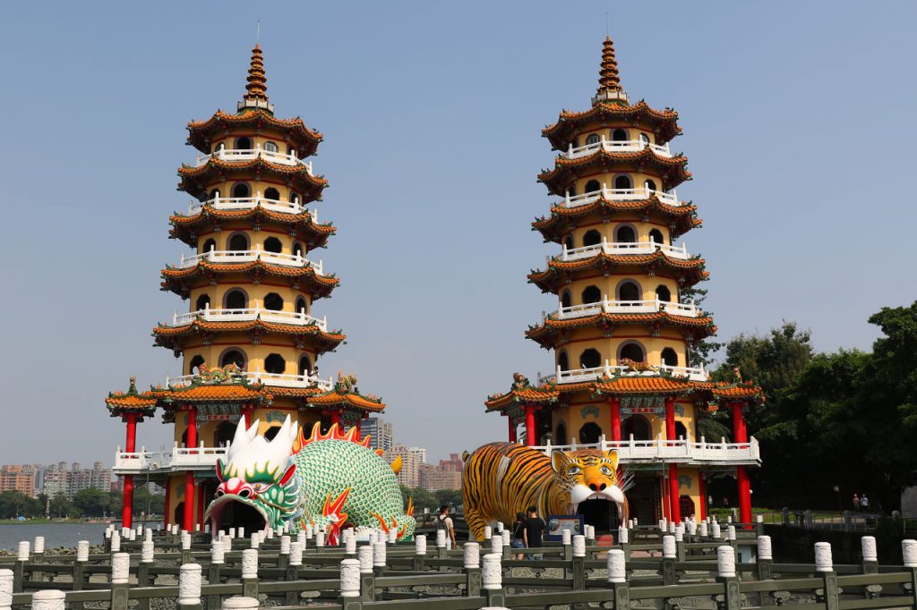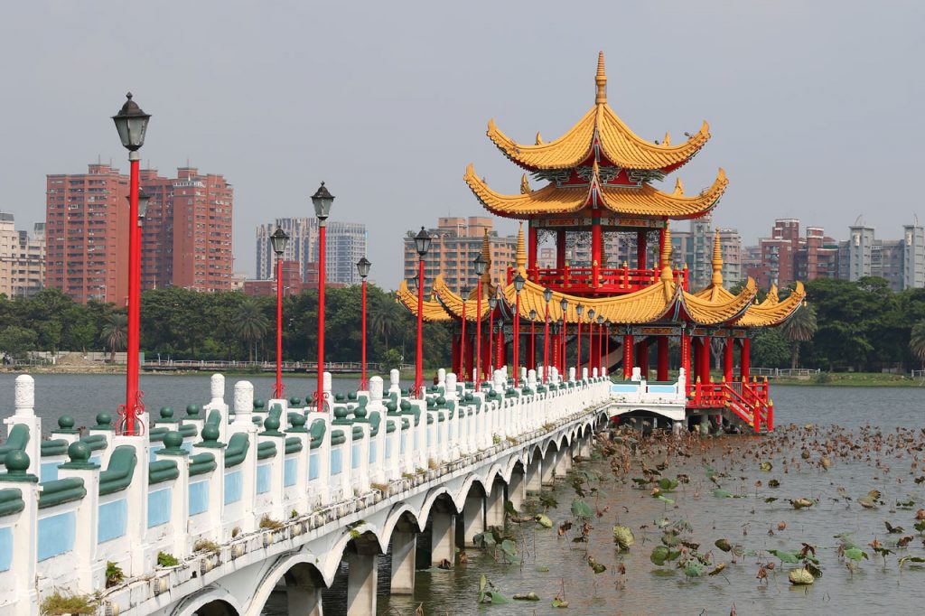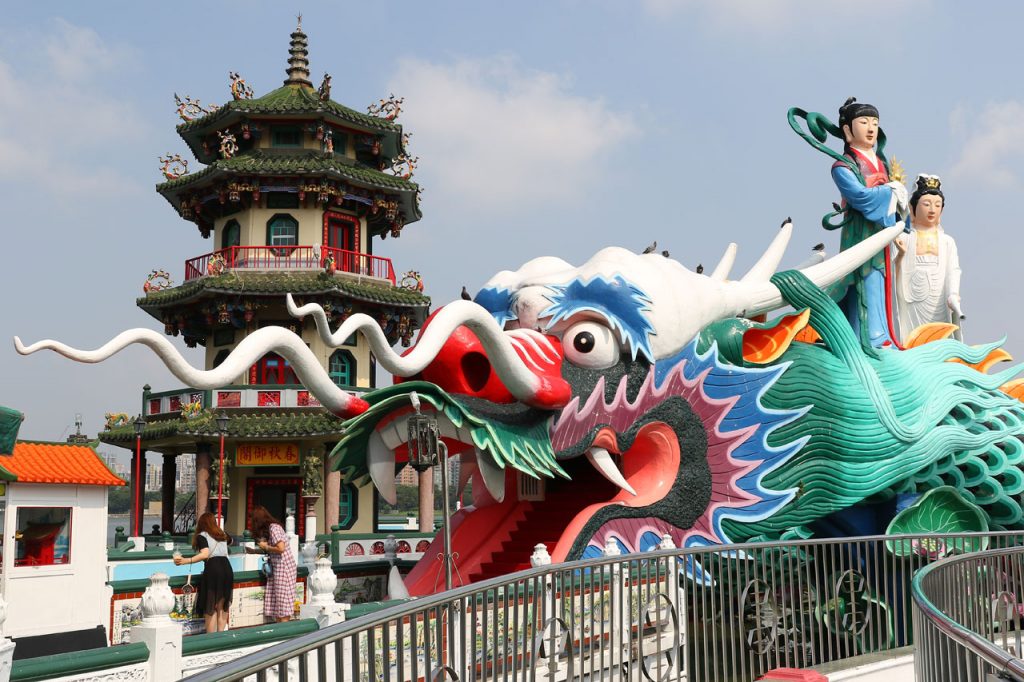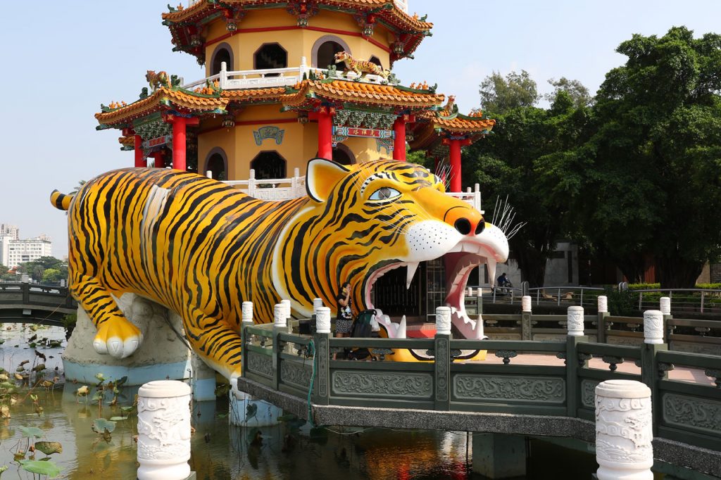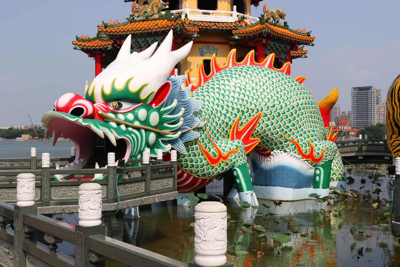 C’est complètement fracassé par la chaleur que nous partons enfin vers Koahsiung. Je vous avoue que j’étais prêt à faire un détour pour rester au frais dans la voiture plus longtemps. Nous arrivons donc dans le nord de ville à la Lotus Pond. Un grand plan d’eau au bord duquel se trouve quelques bricoles à voir. Nous nous mettons en quête d’une place de parking, je me pose le long d’un trottoir dans une place et nous partons sous une chaleur infernale de l’autre côté de la rue au temple de Confucius. Oui parce que chaque ville à la sien, histoire de ne pas faire de jaloux. Celui-là ne casse pas des briques. Les autres choses à voir ne sont qu’à quelques centaines de mètres mais Aurélie abdique et me dit que c’est mort, on y va en voiture. Ok.