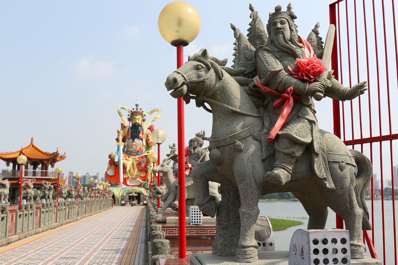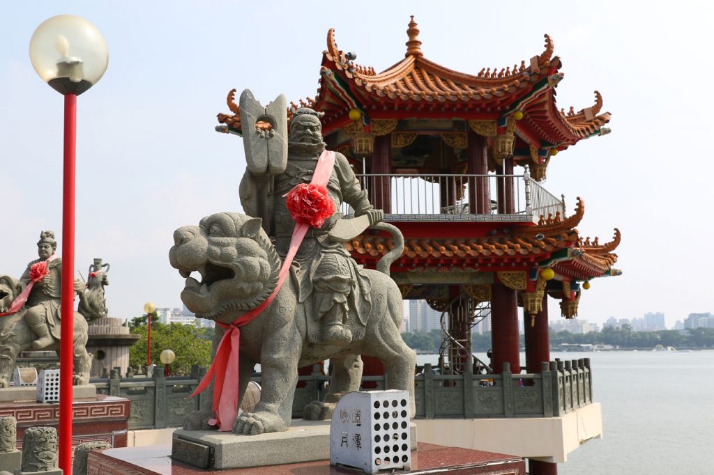 Nous partons donc voir le temple Zuoying Yuandi. Une espèce de statue de l’immondice se trouvant au bout d’une jetée sur le plan d’eau. Horrible. Le seul truc sympa se sont les statues de divinités quelconques à cheval sur divers animaux de chaque côté de la dite jetée. Et pour couronner le tout, 2 vieux font un karaoké aux portes du temple. Un truc à faire regretter un solo d’Yvette Horner tellement ça chante faux.