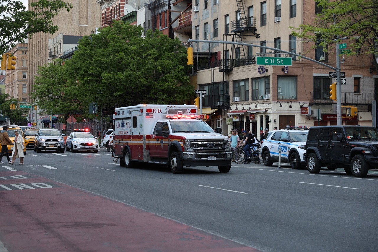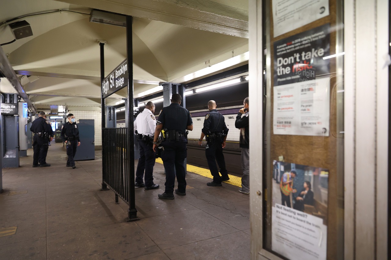 Après cela, retour à l’hôtel. Enfin c’est que nous croyons. Nous repartons tranquillement d’Harlem par la station de la 125ème rue, c’est direct pour nous. NORMALEMENT. Au bout d’un moment je regarde le trajet je dis à Aurélie « c’est la prochaine ». Quelques instants passent, elle me dit « c’est pas si long que ça d’habitude ». Et elle a raison. Pour une raison que nous ignorons, le train ne s’est pas arrêté à notre station et nous voilà à Brooklyn. Bon en soit nous avons juste à traverser le quai pour repartir dans l’autre sens. Sauf que quand nous descendons, nous sommes accueillis par une quinzaine de policiers. Lampes torches à la main, ils cherchent quelque chose sur le quai et la voie. En écoutant ce que raconte le responsable (chemise blanche sur la photo), je comprends qu’ils ont trouvé des traces de sang sur le quai, qu’un avis de recherche est lancé dans tous les hôpitaux du secteur et qu’il faut à priori descendre sur la voie pour une inspection plus poussée.