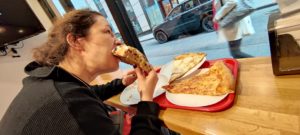 Nous parvenons enfin à l’hôtel. La pause est bienvenue et Aurélie veut manger. C’est parti pour la pizzeria du coin de la rue. Typique de ce qu’on peut trouver à NY. C’est copieux et le prix est inversement proportionnel aux nombre de calories. Après avoir engloutie 2 parts conséquentes: « c’est le meilleur repas du voyage ».