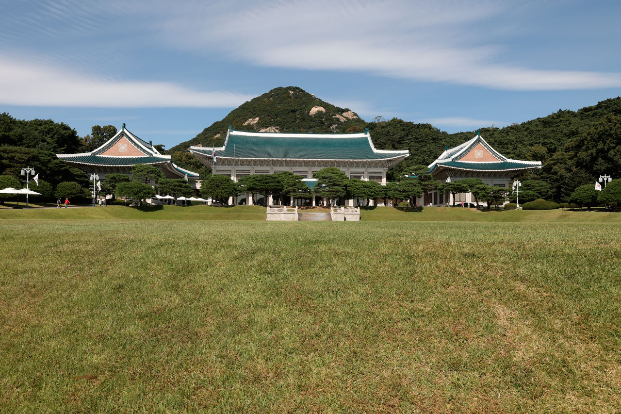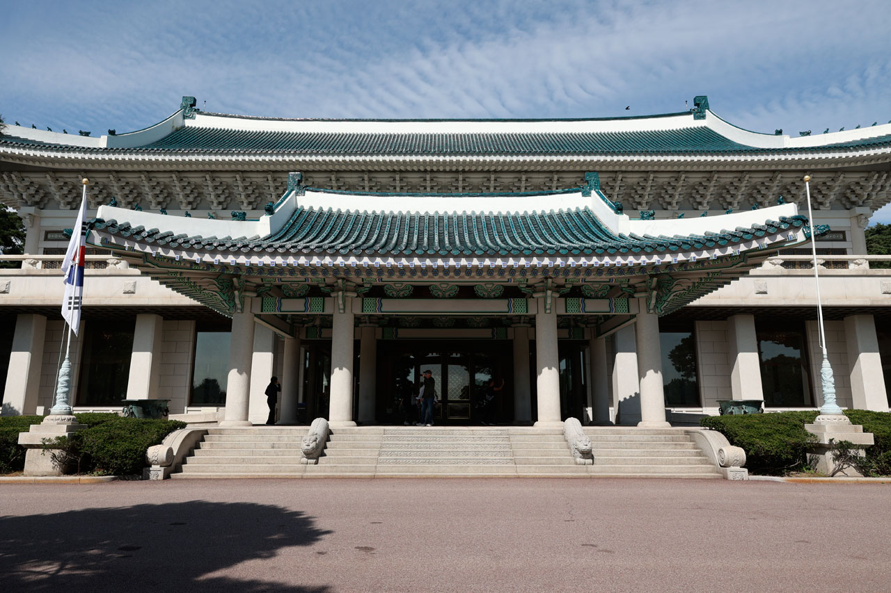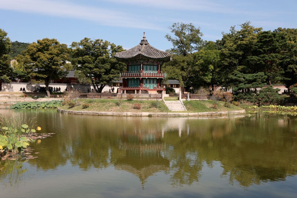 Sinon le Gyeongbokgung ? Joli. Très joli même. Cela étant, comme l’a fait remarqué Aurélie. Les pavillons de ce type, quand tu en as vue au Japon et à Taïwan comme nous, à un moment, ça finit par un peu se ressembler. Certes on voit les différences avec ceux des 2 exemples cités mais globalement c’est variations sur le même thème. Seul le cadre peut faire la différence. Ici avec tout cet espace autour c’était vraiment sympa. Nous passerons un long moment à tourner dans le parc pour finir au Hyangwonjeong Pavilion qui comme son nom l’indique est un pavillon. Il est posé au milieu d’un petit étang. Quelques photos plus tard, nous sortons à l’exact opposé d’où nous sommes rentrés dans le parc du Gyeongbokgung. Erreur? Non. Nous traversons la rue pour aller à Cheongwadae.