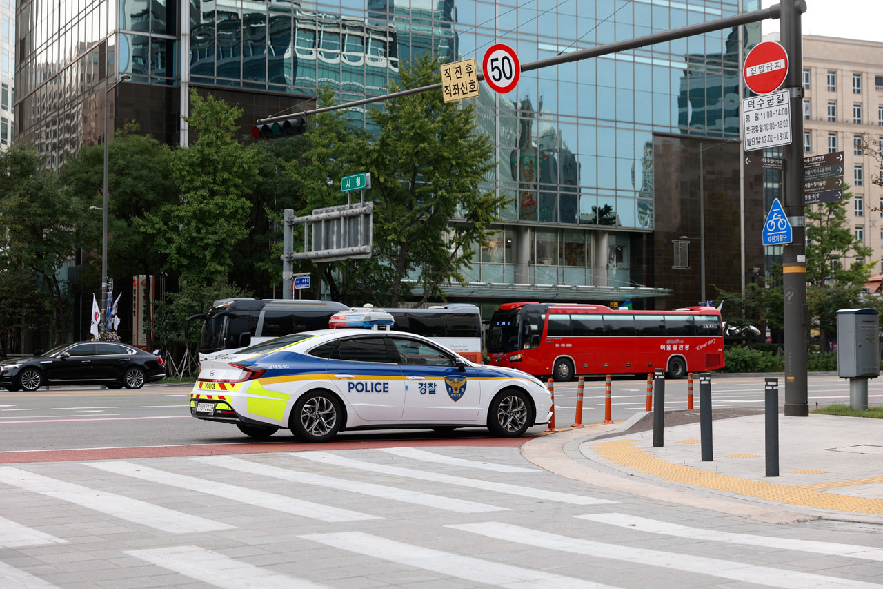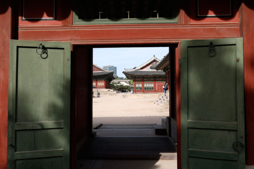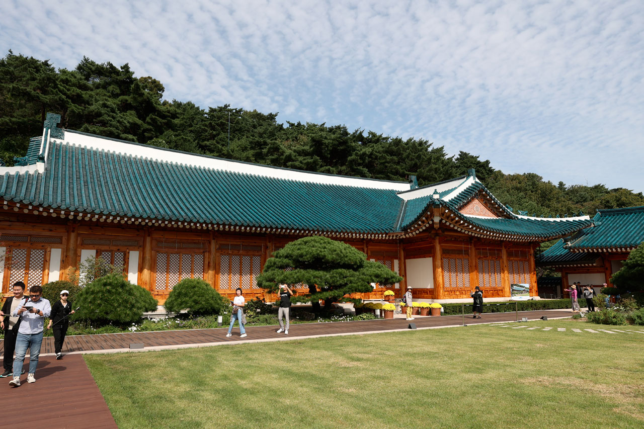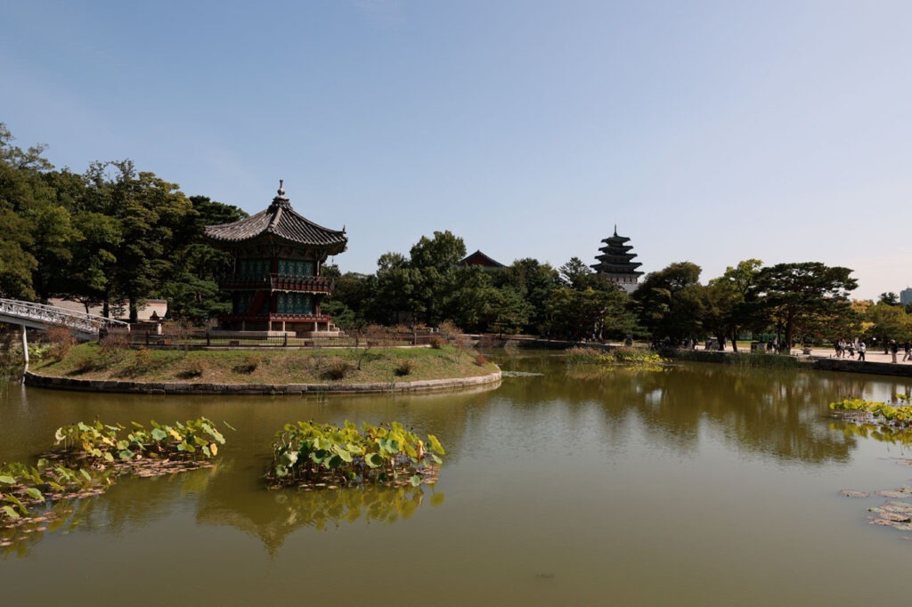 Sinon le Gyeongbokgung ? Joli. Très joli même. Cela étant, comme l’a fait remarqué Aurélie. Les pavillons de ce type, quand tu en as vue au Japon et à Taïwan comme nous, à un moment, ça finit par un peu se ressembler. Certes on voit les différences avec ceux des 2 exemples cités mais globalement c’est variations sur le même thème. Seul le cadre peut faire la différence. Ici avec tout cet espace autour c’était vraiment sympa. Nous passerons un long moment à tourner dans le parc pour finir au Hyangwonjeong Pavilion qui comme son nom l’indique est un pavillon. Il est posé au milieu d’un petit étang. Quelques photos plus tard, nous sortons à l’exact opposé d’où nous sommes rentrés dans le parc du Gyeongbokgung. Erreur? Non. Nous traversons la rue pour aller à Cheongwadae.