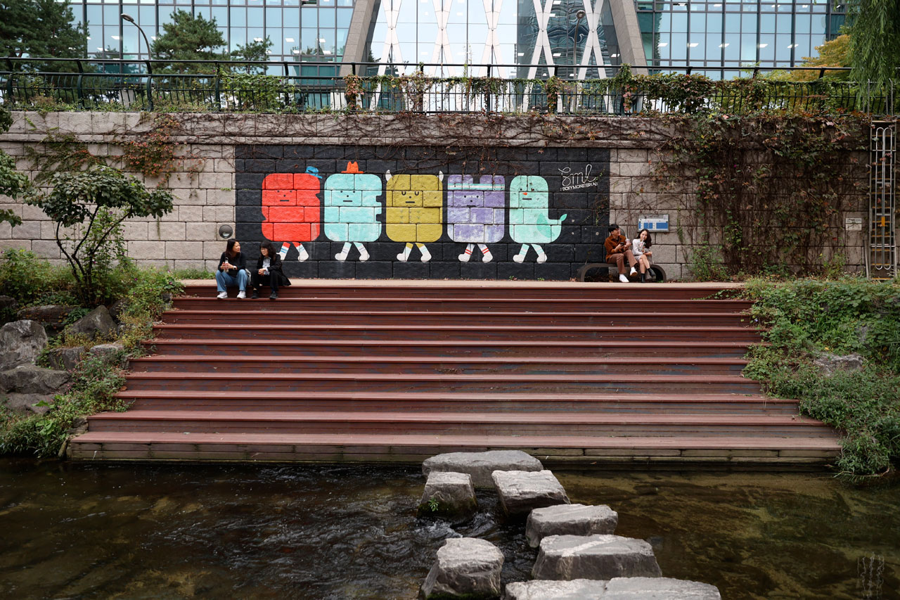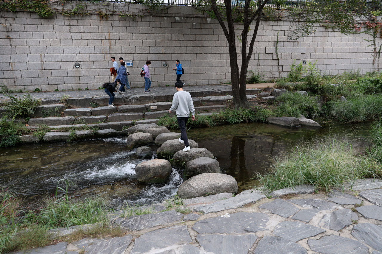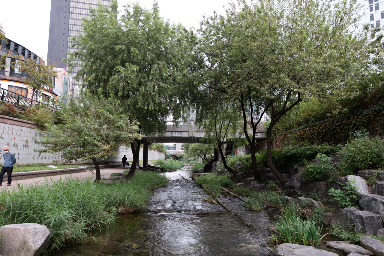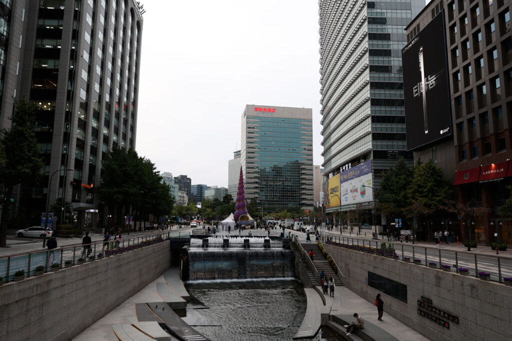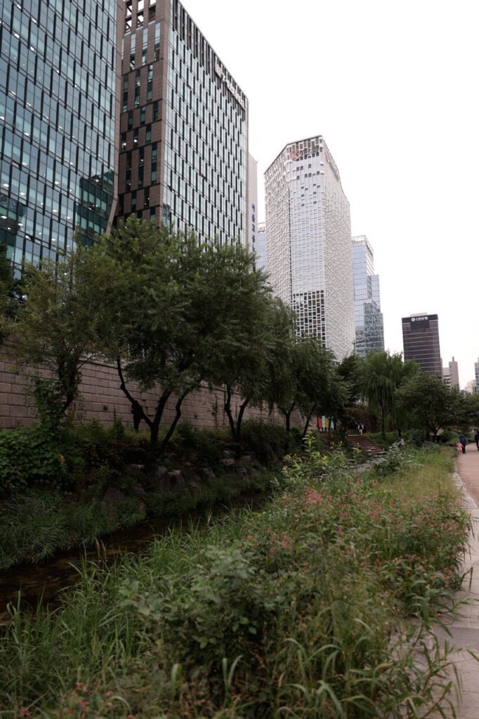 Sortant de là, nous repartons vers l’hôtel un peu au pif en traversant des quartiers aux ambiances bien différentes. De celui spécialisés dans le bricolage et le gros œuvre, nous nous sommes retrouvés chez les diamantaires et courtiers en métaux précieux. Rigolo. Nous sommes ensuite remontés le long du canal Cheonggyecheon aménagé en contre bas de la route. En temps normal comme aujourd’hui c’est une promenade au calme au bord de l’eau avec des animaux qui font leur vie. Quand il pleut beaucoup, c’est un canal de délestage des eau de pluie (donc fermé au public).