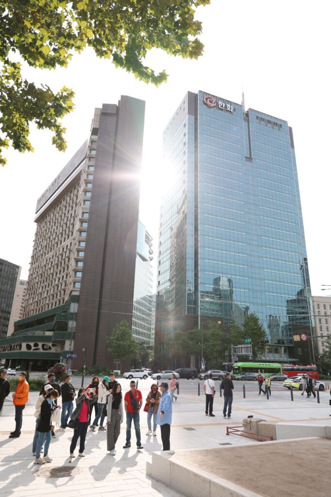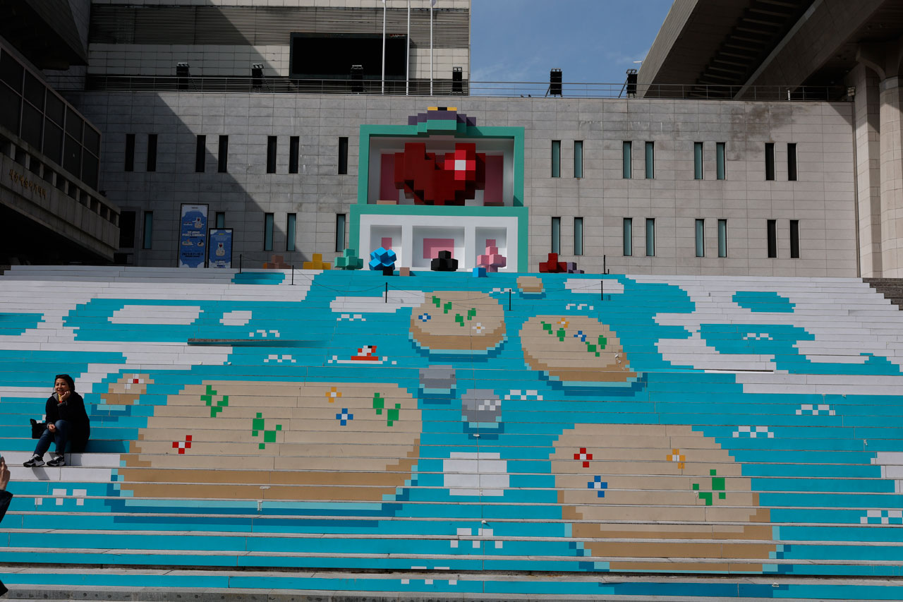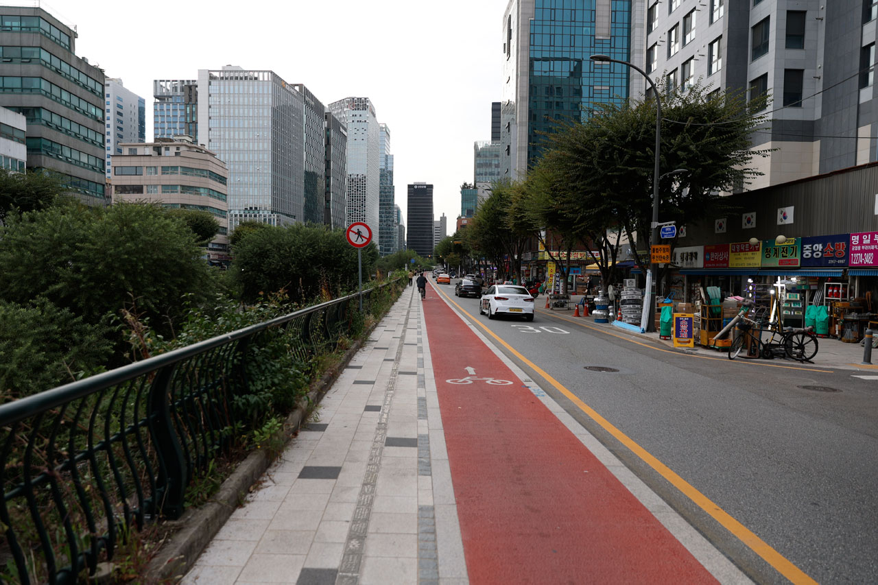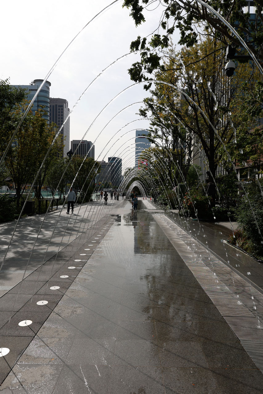 Sortant de là, nous repartons vers l’hôtel un peu au pif en traversant des quartiers aux ambiances bien différentes. De celui spécialisés dans le bricolage et le gros œuvre, nous nous sommes retrouvés chez les diamantaires et courtiers en métaux précieux. Rigolo. Nous sommes ensuite remontés le long du canal Cheonggyecheon aménagé en contre bas de la route. En temps normal comme aujourd’hui c’est une promenade au calme au bord de l’eau avec des animaux qui font leur vie. Quand il pleut beaucoup, c’est un canal de délestage des eau de pluie (donc fermé au public).