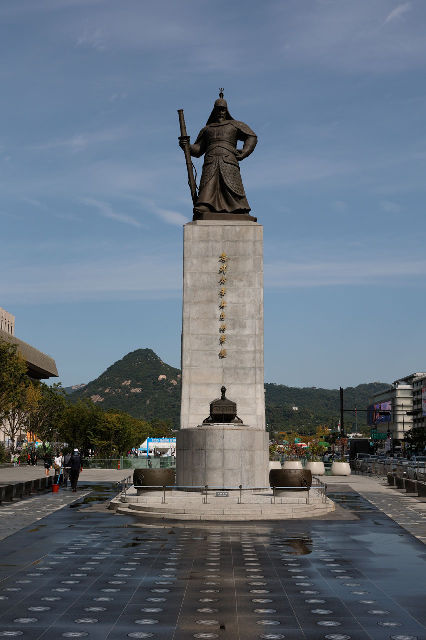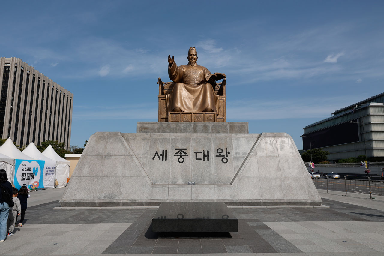 Nous sortons de là pour aller au Gyeongbokgung qui est « le palais » à voir dans Séoul. En chemin nous stopperons devant la statue du roi Sejong Le Grand. Personnage important dans l’histoire du pays puisque c’est à lui que l’on doit l’hangeul – l’alphabet coréen. Truc « amusant », derrière le socle de la statue se trouve l’entrée d’un musée (gratuit) qui retrace son règne. On peut passer devant sans la voir. Le musée est en sous sol, sous la rue et est absolument énorme. Comme c’est archi blindé de groupes scolaires, nous en ferons le tour rapidement.
