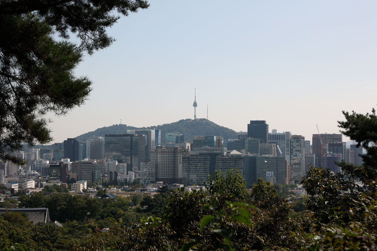 Aurélie, toujours aventureuse, me traîne faire le tour du jardin. Sauf que Séoul, à cet endroit, c’est raide. Très raide. Mais la grimpette valait le coup. Entre les arbres, la récompense était un petit panorama sur la partie de la ville que nous explorons depuis ce matin et qui doit représenter environ 10 à 15% de la superficie de Séoul. Séoul ce n’est pas grand, c’est absolument gigantesque. En dînant ce soir nous avons fait notre programme de demain, les temps de trajet en métro sont débiles. Mais je digresse.