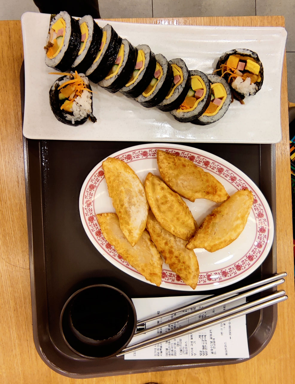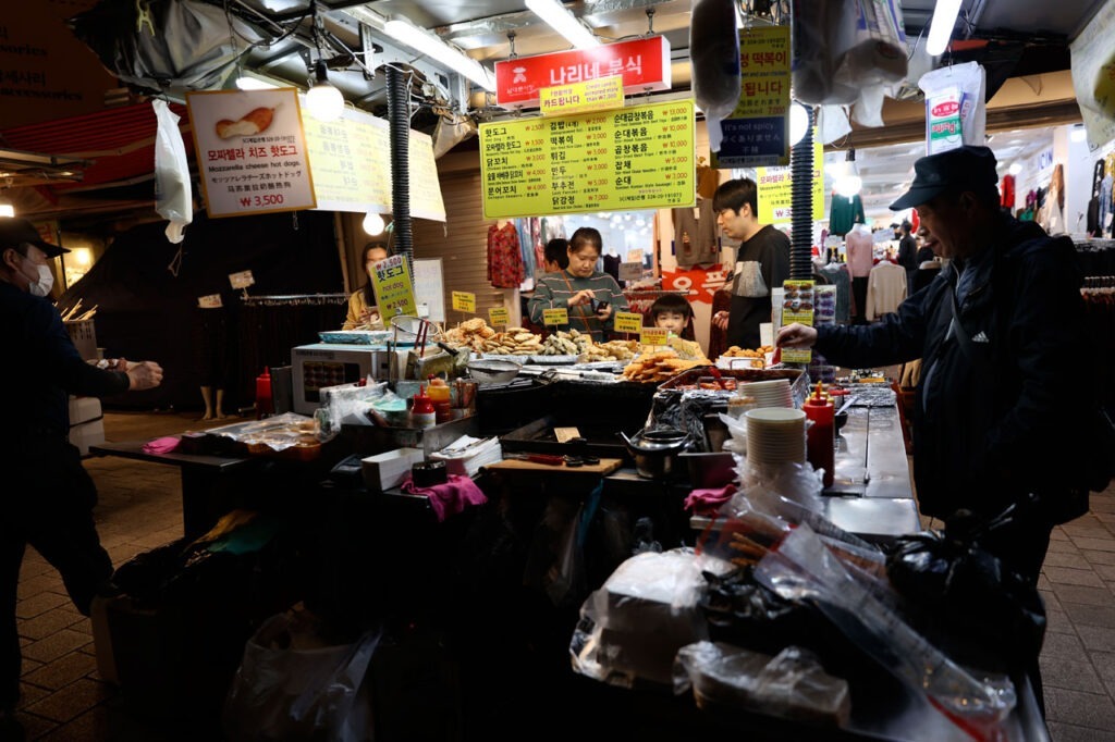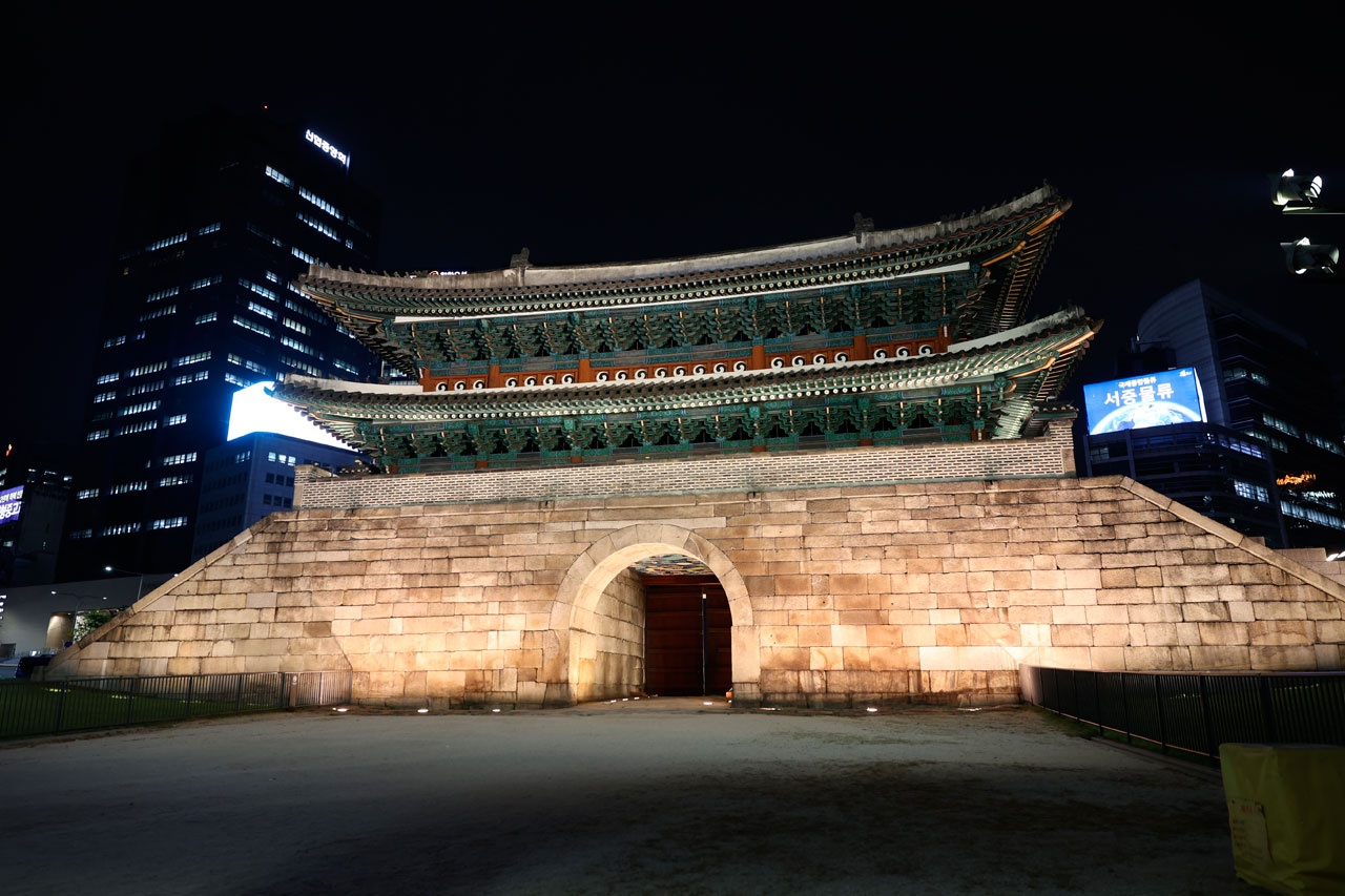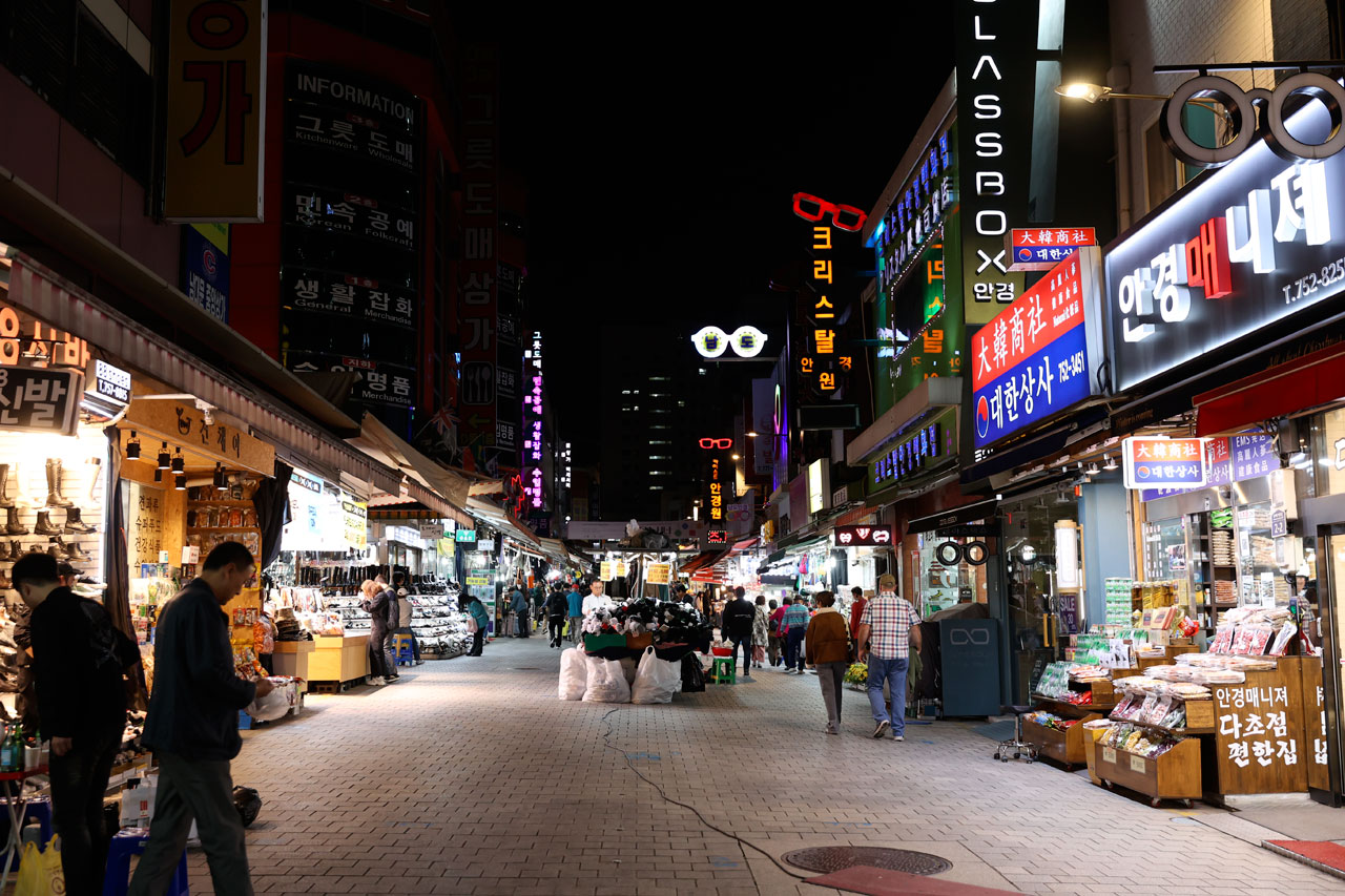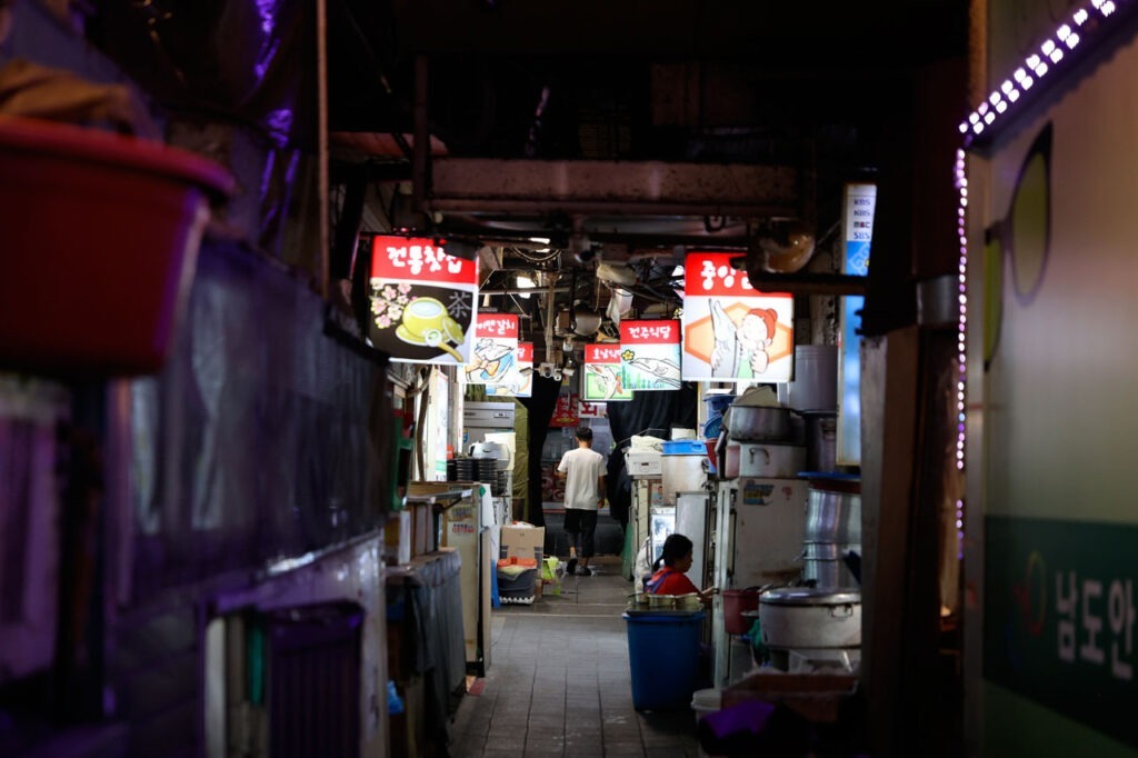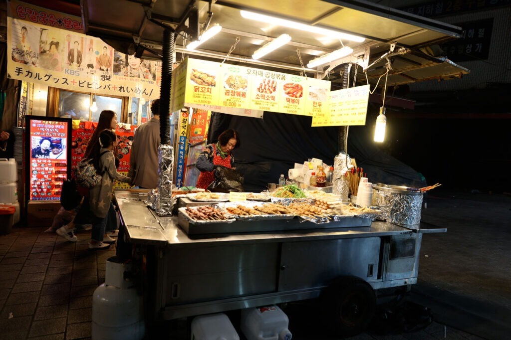 Courte pause à l’hôtel puis nous décidons d’aller au marché de nuit de Namdaemun qui est 5 minutes à pied. Le concept du marché de nuit c’est qu’il ouvert la nuit. En théorie du moins. Parce que même si ici il fait nuit à 18h30, tout ou presque dans ce foutu marché est fermé à 19h. Une connaissance d’Aurélie nous avait conseillé de venir là parce que soit disant « on y mange bien ». Ce que nous avons vu dans les étales ne nous a pas emballé. Nous nous sommes rabattus sur une sorte de cantine typique de ce qu’on trouve ici ou au Japon. Bien que le patron parle peu anglais, nous nous sommes compris sans souci. C’était simple et vraiment très sympa.