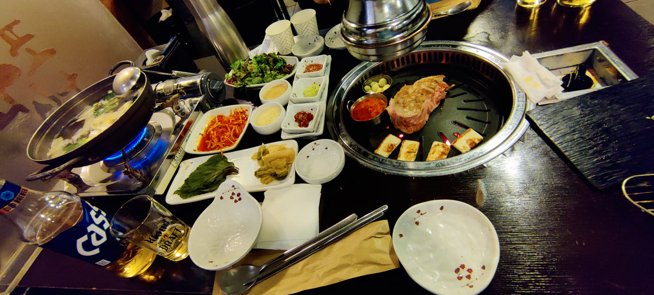 Mais non parce qu’il faut dîner. Heureusement, littéralement à 30 mètres de l’hôtel se trouvent une rue pleine de restaurants. Nous en choisirons un au pif. Ce sera barbecue coréen. La serveuse nous explique comment le menu fonctionne car pour pouvoir commander certaines choses, il faut en avoir pris d’autres au préalable. Dit comme ça, ça l’air d’une arnaque mais pas du tout. Nous partons donc sur un bon gros morceau de cochon. Là on nous amène des condiments et sauces et en plus de la soupe. Puis on nous pose un énorme morceau de viande sur le barbuc’ et là avec Aurélie on se regarde en se demandant ce que nous sommes censés faire du machin. Là le serveur revient et commence à nous le préparer. Ouf. Pour la petite histoire c’est comme ça que ça fonctionne ici, ce n’est pas juste pour nous « cons » d’occidentaux. En fin de préparation, le serveur nous conseille un mélange de sauce et nous précise ce qui est épicé et ce qui ne l’est pas. La suggestion du chef (si j’ose dire) était simplement incroyable. Avec une viande de cette qualité en plus… v’la le repas. Contents mais fatigués, nous rentrons pour essayer de de dormir.