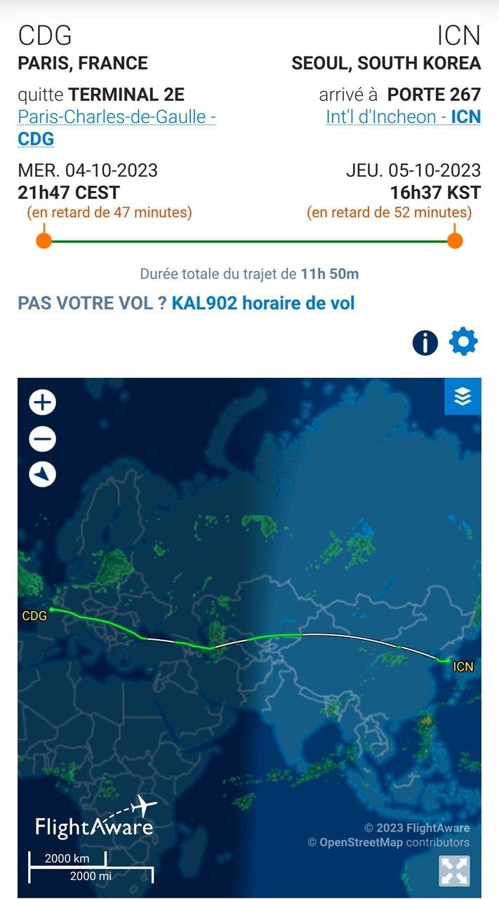 Le vol part 17 minutes de retard en plus des 30 minutes annoncés le matin même (et en aura 52 à l’arrivée). Ca se passe gentiment. L’offre de films est pléthorique, l’écran et le son de très bonne qualité. Pour regarder Indiana Jones 5 (nouvelle éclatante preuve que tout ce que touche Disney se transforme en truc marron qui ne sent pas bon) c’est presque trop. Je battrai également mon record d’heure de sommeil en avion avec 5. Comme les vols sont plus long vers l’Asie puisqu’on ne peut plus survoler la Russie ce n’est pas un mal.