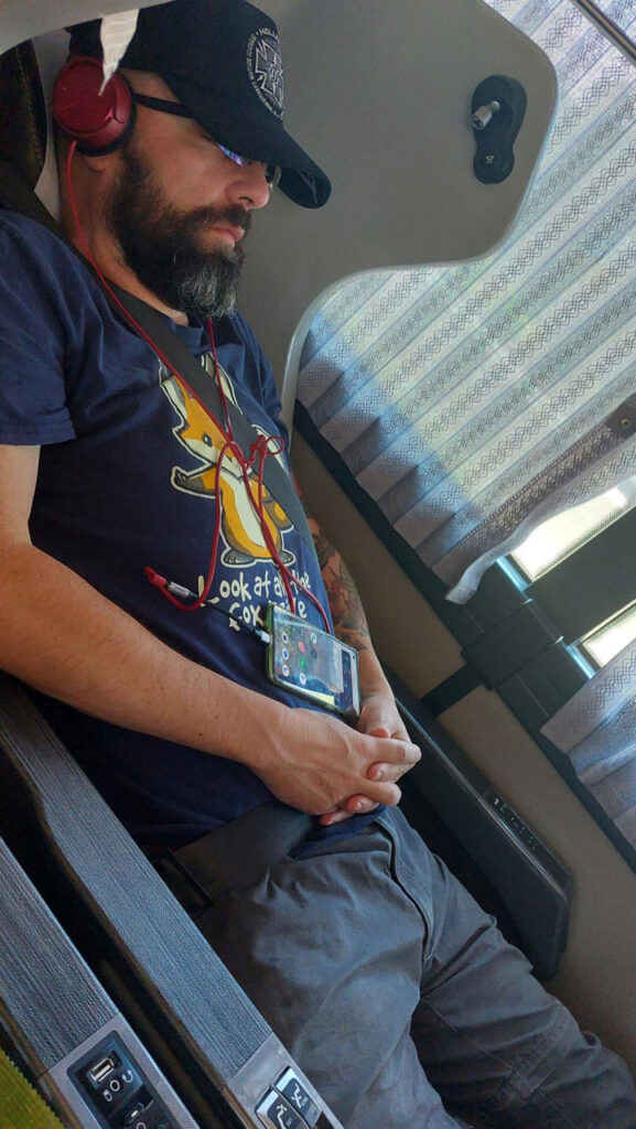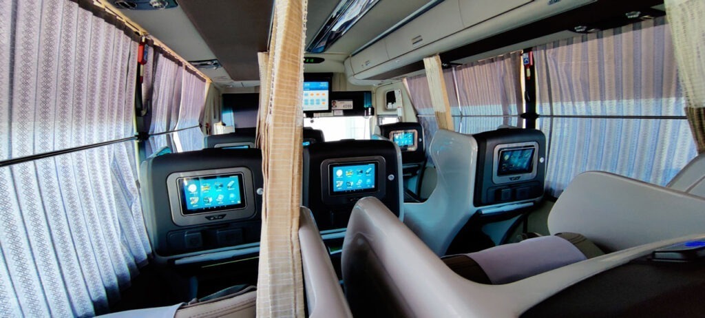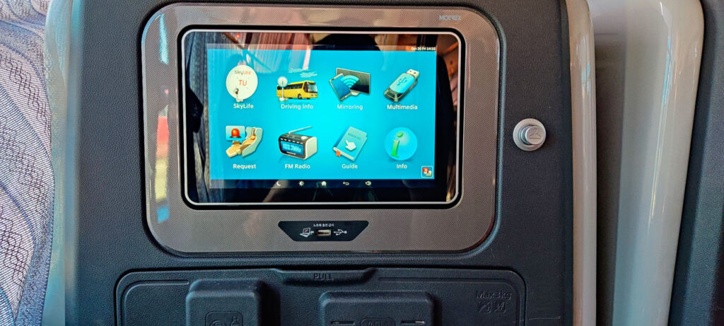 Alors qu’a t-il de plus qu’un bus normal? Un siège plus large et inclinable électriquement, une tablette, un support de recharge sans file pour téléphone, des prises USB pour recharger tout et n’importe quoi, une lumière de courtoisie, un rideau de séparation avec son voisin et surtout un écran personnel. L’écran permet de suivre le trajet en direct (si l’option est activée par le chauffeur), d’écouter la radio via la prise casque sur l’accoudoir, de regarder la télé mais il peut aussi servir d’écran déporté pour votre ordinateur ou votre téléphone. Je me suis donc empressé de mettre une vidéo YouTube sur l’écran. Le plaisir de regarder ça en étant presque mieux installé qu’à la maison tout en allant de A à B.