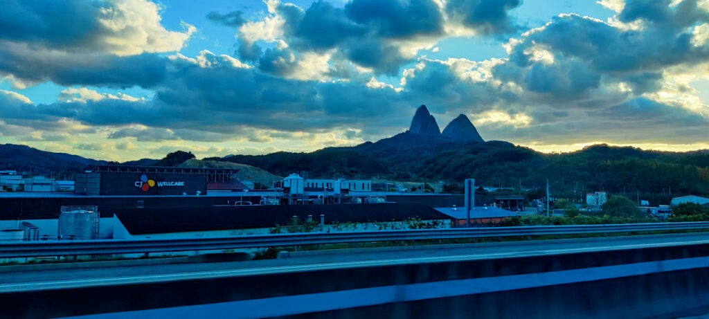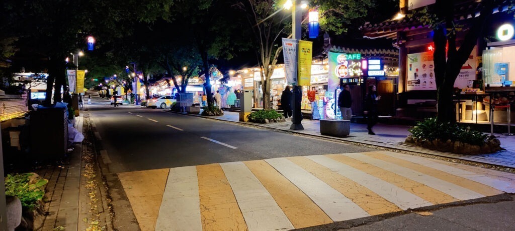 Le trajet devait durer environ 3h, nous mettrons finalement près de 3h40 pour rallier Jeonju. La faute aux embouteillages à l’arrivée.Une fois débarqué, la première impression de la ville fût pour le moins mitigée. Il fait « froid », nous avons perdu plus de 10° depuis ce matin, on a manqué de se faire écraser par un mec qui a grillé un feu et après presque 4h de route, nous sommes un peu saoulé car en plus nous avons faim et il faut aller à l’autre bout de la ville pour notre maison d’hôtes. Je vous épargne le trajet en bus avec un psychopathe au volant.