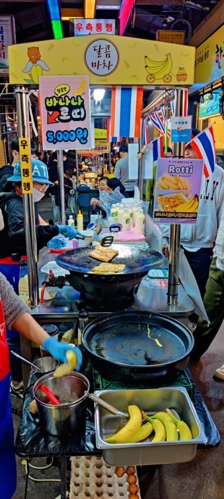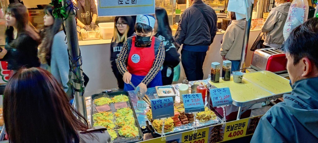 Là-dessus nous partons dîner. La rue principale toute proche n’est pas très encourageante pour trouver de quoi manger par contre il y a un Kakao Store. Je regarde vite fait sur Naver, à priori il y a une petite rue pas loin avec des restos et… miracle! Mieux que des restos, un marché de nuit! Donc l’embarras du choix. Après un tour de repérage, chacun choisit son plat et nous squattons une étale qui fera office de banc improvisé.