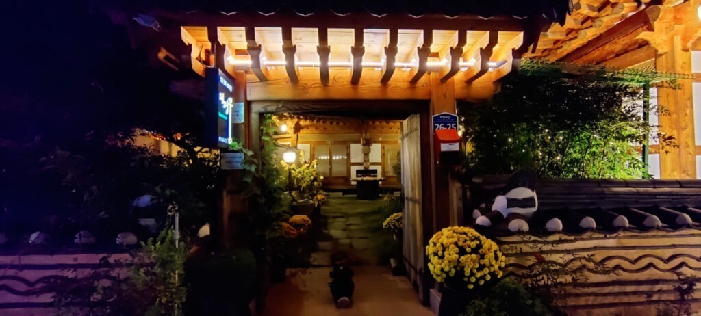 Il fait nuit quand nous arrivons. Pas âme qui vive autour de la maison d’hôte. Il faut dire que nous arrivons autour de 18h ce qui pour ici est tardif. Soudain une dame âgée sort de nulle part et nous accueille. Elle nous amène à notre chambre, nous fait un briefing complet de ce qu’il faut et ne faut pas faire, tout ça dans un mélange d’anglais, de coréen et de traduction instantanée par téléphone interposé. Elle insiste lourdement sur le fait qu’il faut vite rentrer ou sortir de la pièce car les moustiques sont ici ultra énervés. Aurélie en a dézingué 2 et moi 1.