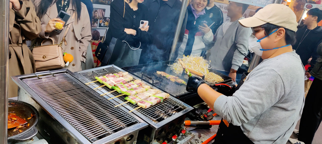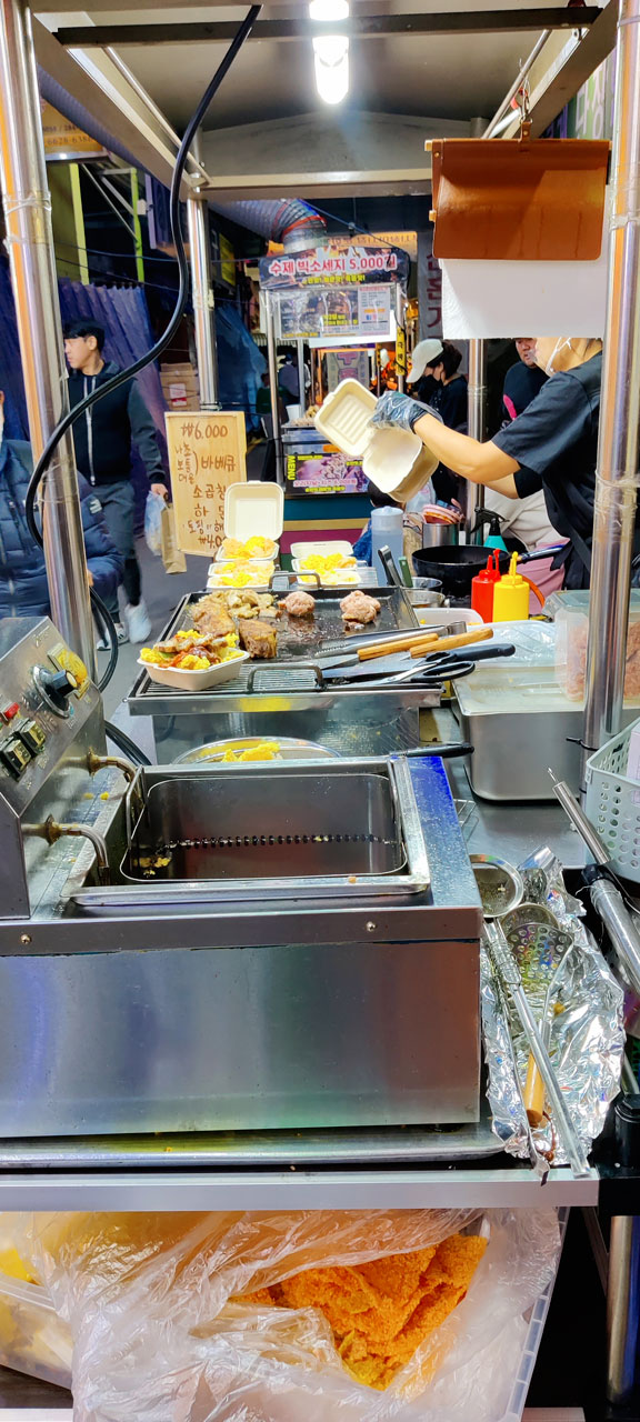 Là-dessus nous partons dîner. La rue principale toute proche n’est pas très encourageante pour trouver de quoi manger par contre il y a un Kakao Store. Je regarde vite fait sur Naver, à priori il y a une petite rue pas loin avec des restos et… miracle! Mieux que des restos, un marché de nuit! Donc l’embarras du choix. Après un tour de repérage, chacun choisit son plat et nous squattons une étale qui fera office de banc improvisé.