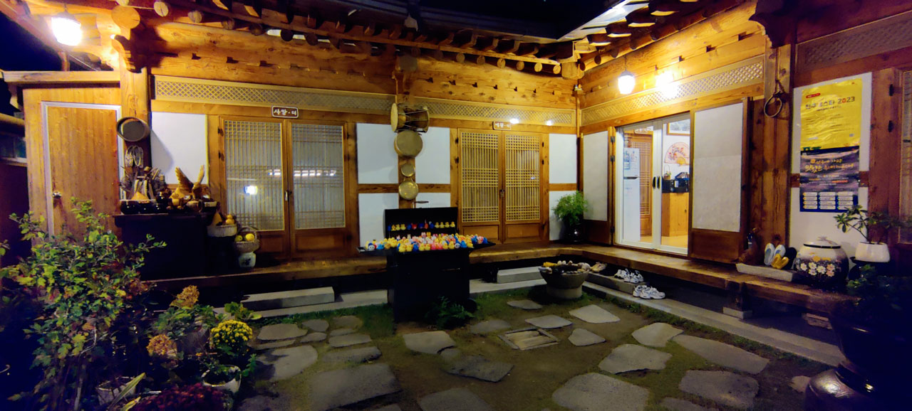Il fait nuit quand nous arrivons. Pas âme qui vive autour de la maison d’hôte. Il faut dire que nous arrivons autour de 18h ce qui pour ici est tardif. Soudain une dame âgée sort de nulle part et nous accueille. Elle nous amène à notre chambre, nous fait un briefing complet de ce qu’il faut et ne faut pas faire, tout ça dans un mélange d’anglais, de coréen et de traduction instantanée par téléphone interposé. Elle insiste lourdement sur le fait qu’il faut vite rentrer ou sortir de la pièce car les moustiques sont ici ultra énervés. Aurélie en a dézingué 2 et moi 1.