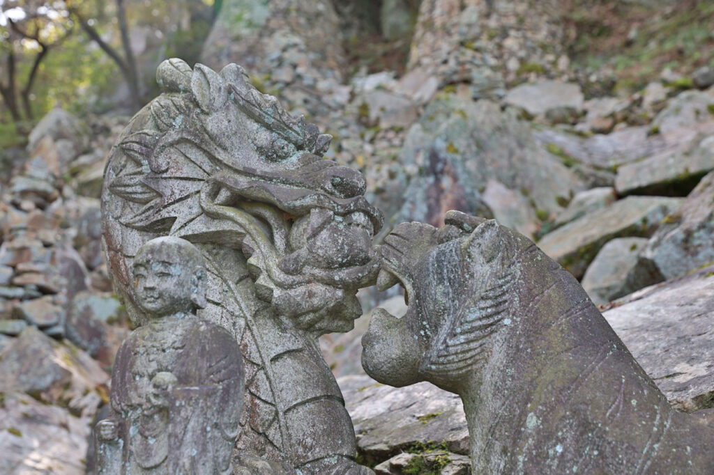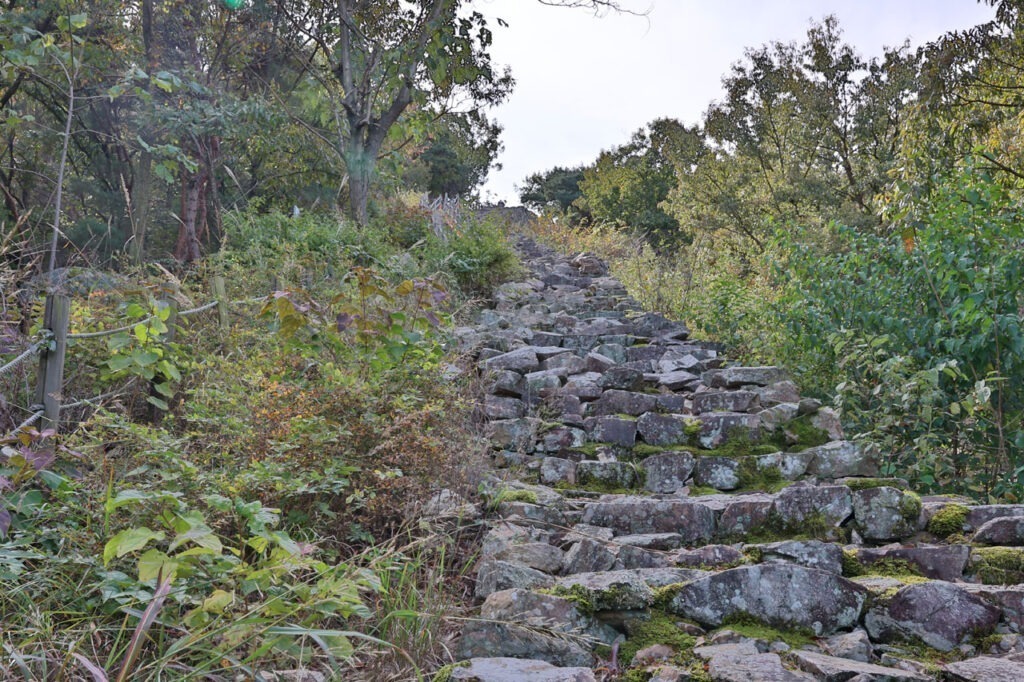 Il faut savoir que la blague récurrente depuis le début du séjour c’est que nous dépassons souvent l’endroit où nous voulons aller sans le voir. En revenant sur nos pas, nous trouvons effectivement un sentier, facilement manquable, qui se transforme très très vite en pente à la raideur absurde à la limite du praticable. Comme Aurélie est déjà loin devant, je suis bien obligé de suivre. Comme d’habitude, je ne la reverrai qu’en haut après avoir escalader la muraille de la forteresse – littéralement. Une fois au sommet, conciliabule pour savoir où sont les ruines. Plus je regarde le plan, plus je me dis que les ruines de la forteresse ne sont ni plus ni moins que le mur d’enceinte et qu’il n’y a pas grand chose d’autre.