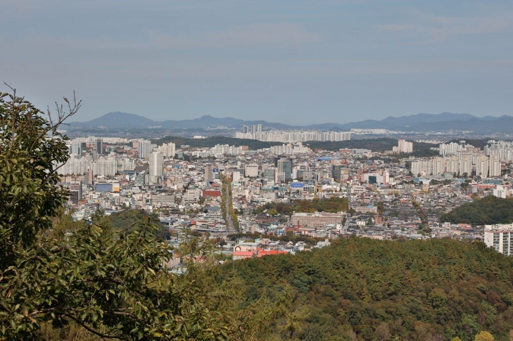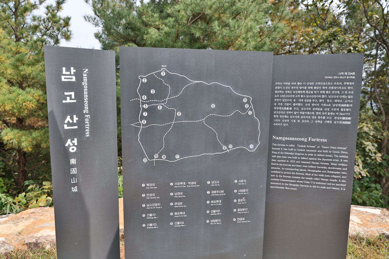 Ce matin direction les ruines de la Namgosanseong Fortress qui, comme son nom l’indique, est une forteresse datant de la dynastie Joseon. Cette dernière se trouve à cheval sur 2 collines dont l’une d’entre elle culmine à 273 mètres d’altitude. Nous voici donc en route, suivant scrupuleusement les plans de la mairie qui indiquent la direction. Nous sortons rapidement de la ville pour nous retrouver sur une route forestière. Jusque là pas de souci. Le petit temple indiqué sur la carte est immanquable. Nous continuons. Arrivé au bout de la route: pas de forteresse ni de ruines ni rien. On a du loupé un truc.