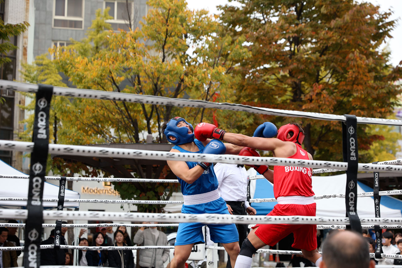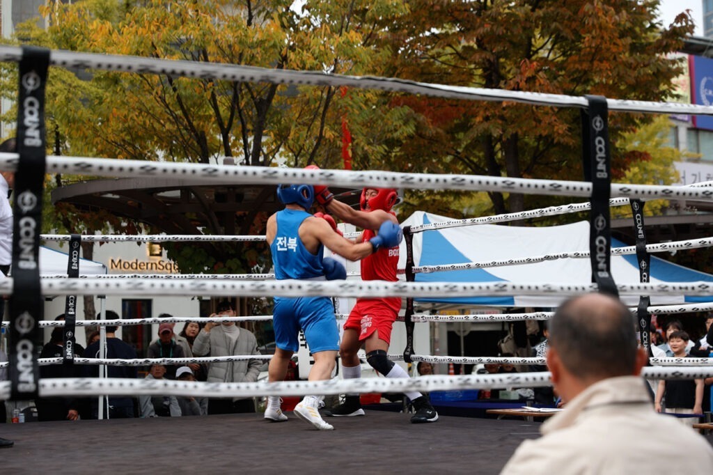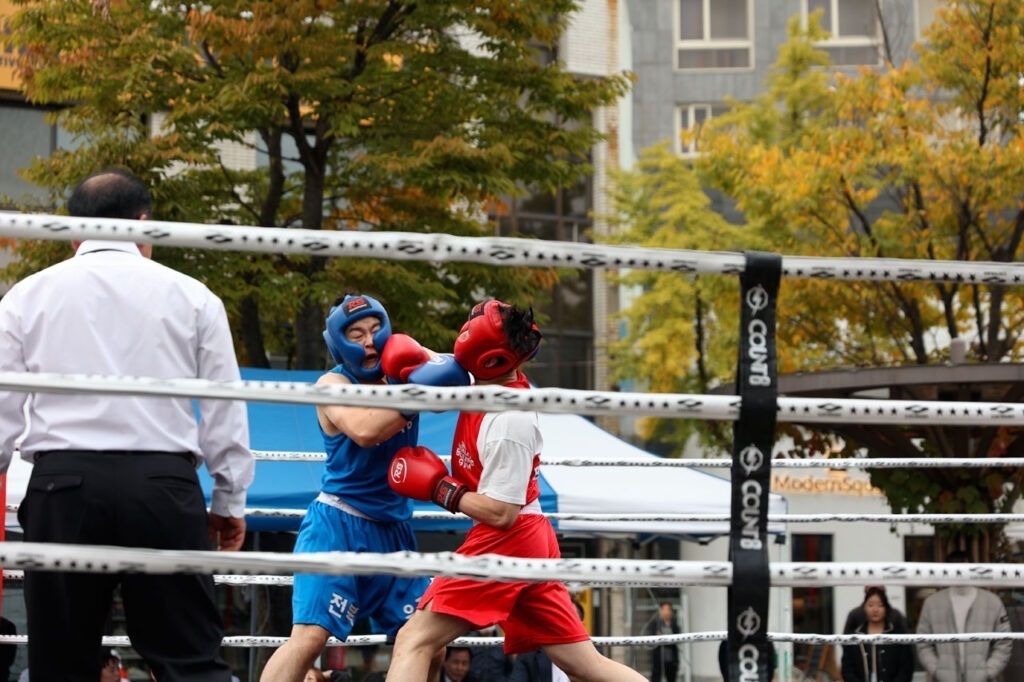 Nous nous décidons finalement à repartir nous promener. Après avoir 2 fois le tour des 2 grosses rues commerçantes, j’aperçois un ring de boxe installer sur une place. Curieux nous allons voir. De ce que nous en avons compris, il s’agit d’une compétition amateur entre 2 clubs de boxe du coin. Nous arrivons sans souci à trouver de bonnes places pour voir les matchs. Ces derniers sont très courts, entre 1 et 3 rounds suivant le niveau.