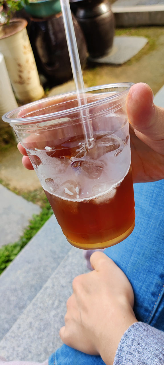 Nous n’aurions dû rester que quelques minutes, nous nous poserons finalement presque 1h. pendant que je bulle sur la balancelle, la dame qui gère les lieux m’appelle. Le temps que j’arrive, elle débarque avec un plateau de boisson. Nous acceptons avec plaisir et la remercions. Un petit thé bien frais ça ne se refuse pas. Sauf que ce n’est pas du thé, c’est de l’alcool de prune fait maison. Servi glacé, ça passe tout seul. Nous avons un moment craint les effets secondaires de l’alcool mais en fait non.