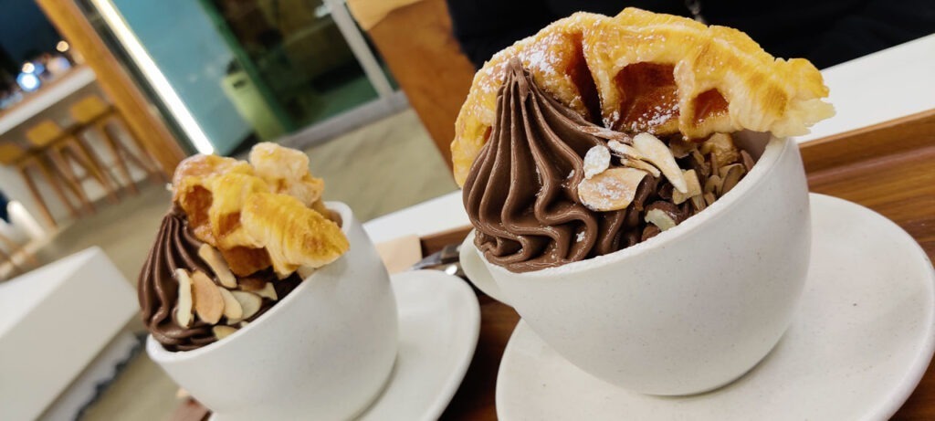 Comme il n’est pas si tard que ça, nous nous demandons quoi faire. Finalement, Aurélie trouve ce qui ressemble à un bar. Nous décidons d’y aller. C’est en fait le bar d’une brasserie de bières locales. Comparé à ce que nous avons payé depuis que nous sommes ici, c’est très cher. On est sur des tarifs parisiens mais les bières étaient pas mal. Ensuite dîner dans un resto du coin et le clou de la soirée: le dessert. Nous trouvons par hasard une sorte de salon de thé qui fait des gaufres, des glaces etc. J’opte pour un « Croffle chocolat » et Aurélie qui partait sur autre chose fini par éhontément me copier. Bref, qu’est-ce qu’un « Croffle ». C’est la contraction de croissant et waffle (gaufre en anglais). Dans les faits ça donne une gaufre faite avec la pâte du croissant. Et c’est servi avec une quantité de glace déraisonnable. Tout ça pour 12 euros les 2. En France ce serait 12 euros pièce avec probablement moins de glace. Passons. C’est délicieux et la serveuse est ravie de savoir que nous avons aimer.