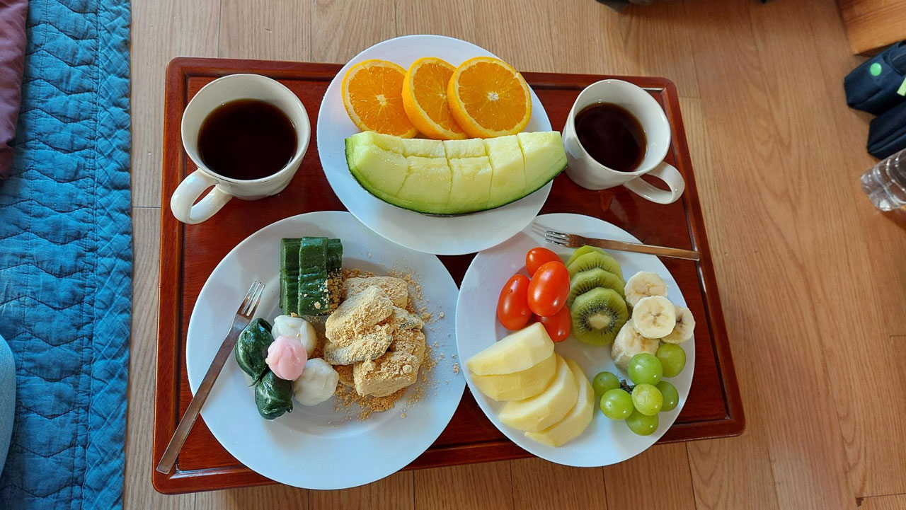 Après une nouvelle nuit sur notre futon favori, comme hier on nous amène notre petit déjeuner directement dans la chambre. Seul point commun avec les autres petits déjeuners: le café est infâme.