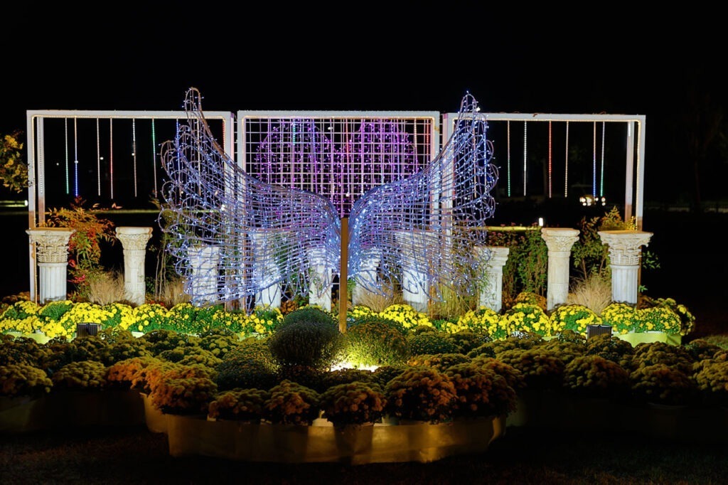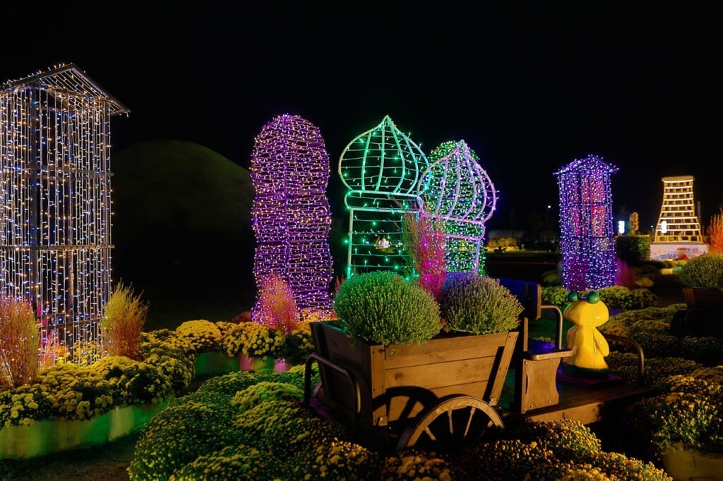 Malgré les courbatures à cause d’avant hier, j’accélère jusqu’au coin de la rue et… plus rien. Aurélie arrive et me dit « regarde! » Et là une armée de spots illuminent le ciel. Ni une ni deux nous traversons la rue, coupons dans un parc et soudain débute une chorégraphie de drones dans la nuit. Comme il est évident que nous n’atteindrons jamais à temps l’endroit où tout cela à lieu, nous nous trouvons un endroit avec une vue dégagée pour regarder le spectacle.