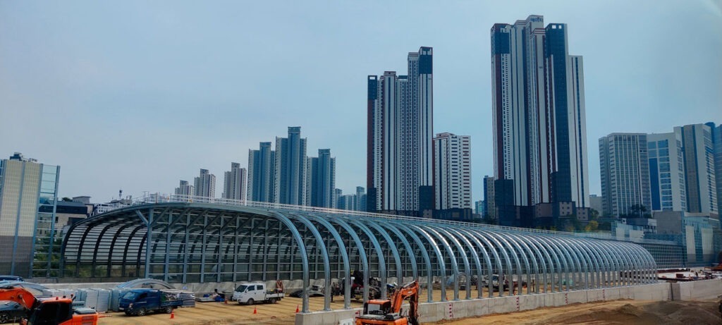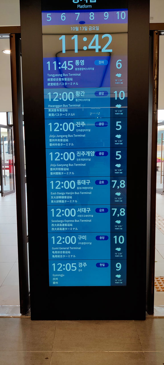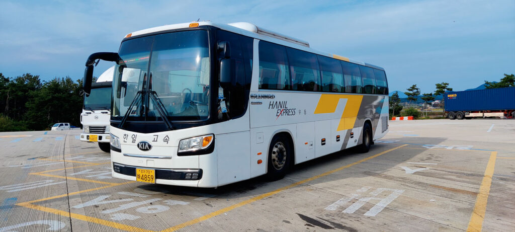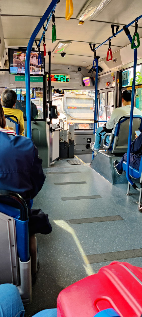 Pas de petit déjeuner proposé par notre hôtel. C’était spartiate – équivalent Ibis chez nous – mais ça a fait le job pour une nuit malgré les murs en carton. Donc direction le Starbucks d’à côté pour avoir quelque chose dans l’estomac. Là-dessus nous poussons un gros soupir las, il va falloir reprendre le métro et se farcir des escaliers à l’infini pour aller prendre le bus. Ou pas. En regardant Naver Maps, je vois que l’appli me propose le bus au lieu du métro. Plus rapide, moins cher et surtout sans escalier. Comme dirait Hubert Bonisseur de La Bath (OSS117) « très bien, faisons comme ça ». L’arrêt de bus est à 200 mètres, une distance tout à fait acceptable pour nos courbatures. Et là, miracle. Le chauffeur de bus attend que nous soyons assis pour démarrer, roule tranquillement, ne met pas de grands coups de frein… Donc un chauffeur de bus qui soit pas possédé, ça existe en Asie.