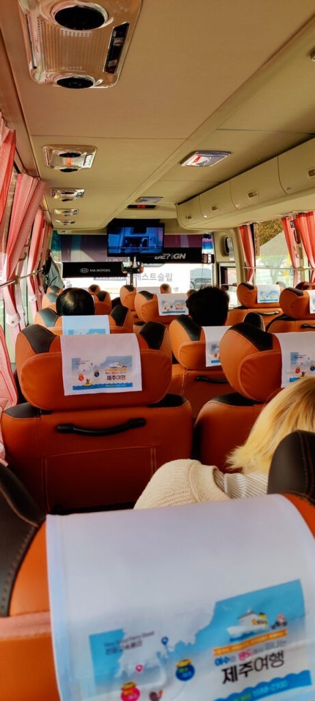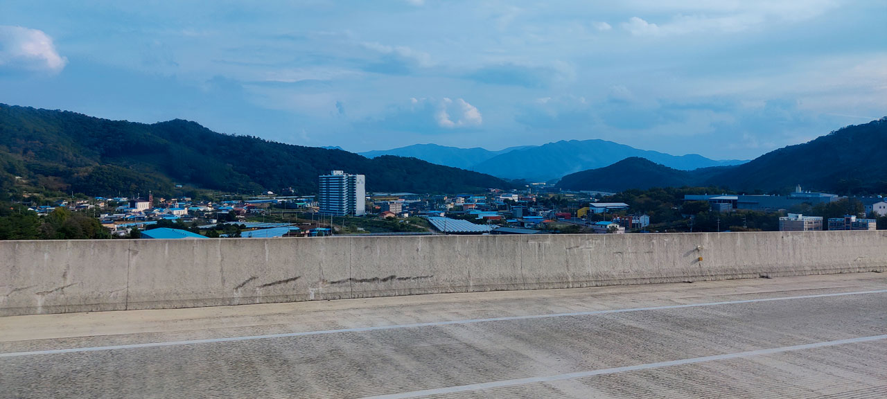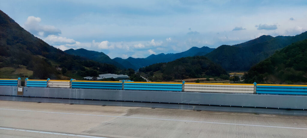 Le bus nous lâche pile devant le bâtiment qui nous intéresse. Plus qu’à patienter jusqu’ 12h05, heure de départ. L’heure et demi d’attente passera assez vite entre achat de pâtisseries faussement françaises et déjeuner avant le départ. 11h57 nous chargeons les valises, 12h05, le bus est parti. La sortie de Séoul sera un peu laborieuse du fait des embouteillages. Ce qui m’a permis de me livrer à ce que j’appelle « le test de la minute ». Montre en main, il s’agit de compter combien de voitures peu communes on peut croiser en soixante secondes. Le résultat est débile.
