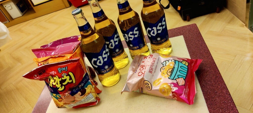 Gyengju donc. De ce que j’ai pu en apercevoir avant le coucher du soleil, c’est comme toutes les villes de Corée que j’ai pu voir jusqu’à maintenant: pas très beau. Mais il y a des choses à voir. Ca sera pour demain. Comme nous avons appris en arrivant qu’il y avait un festival en ville avec des concerts, nous décidons de partir voir ce qu’il en est, avec aussi pour projet de trouver à dîner. Mais avant cela, nous avons transformer la chambre en camp de gitans car il y a une laverie et de la lessive à faire. Il faut donc faire sécher tout ça. En attendant que la machine se finisse: apéro parce que voila.