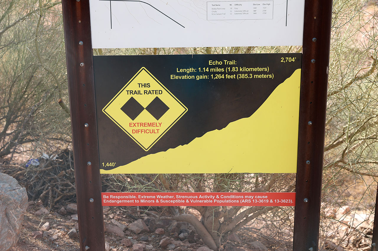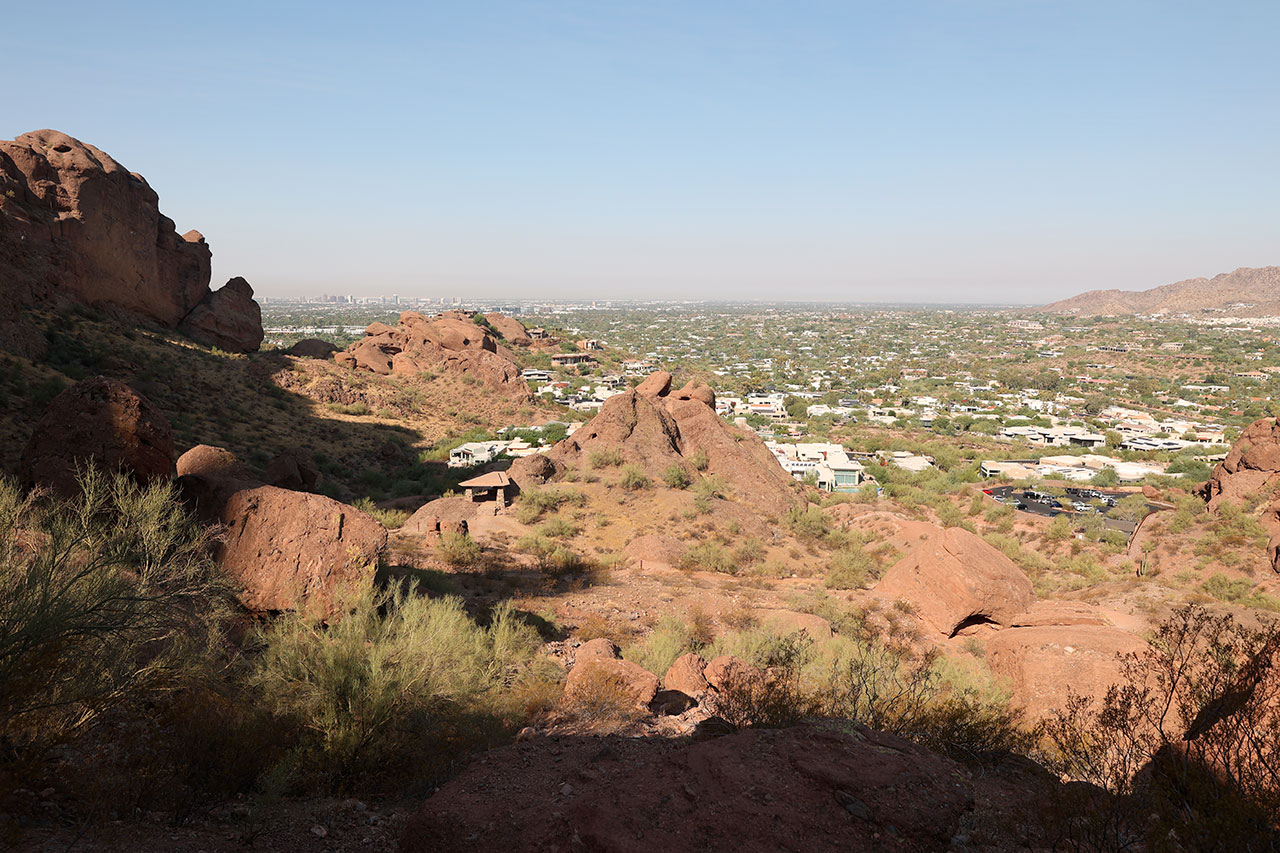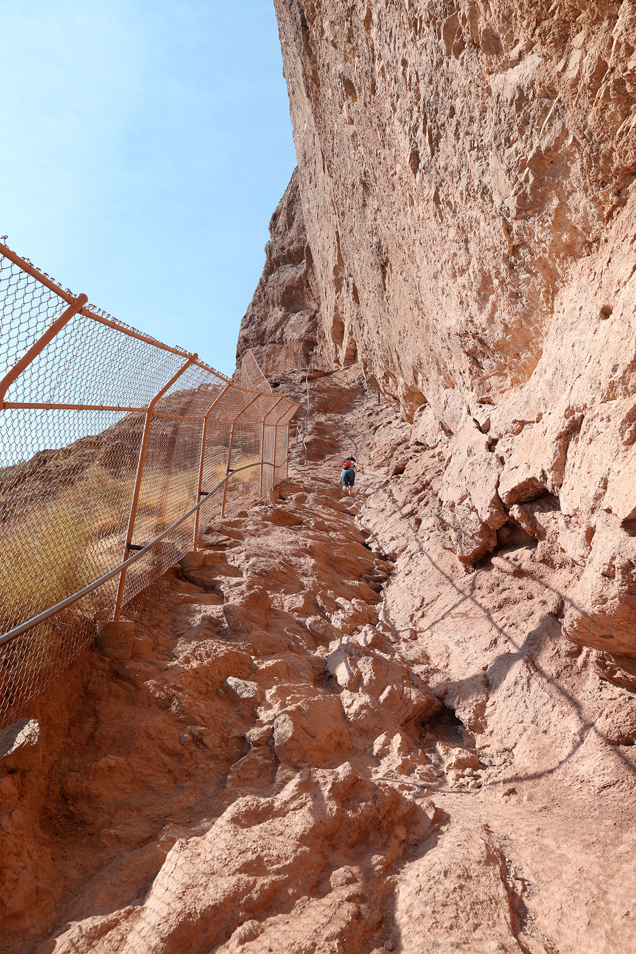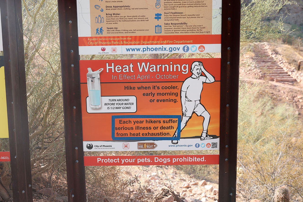 La grande idée du jour (ou de la veille je ne sais plus) est d’aller se faire la rando qui mène au sommet de Camelback Mountain, une petite montagne située au milieu de la ville de Phoenix. Sur le papier, ça l’air un peu énervé mais vraisemblablement rien d’insurmontable. Sauf qu’il est environ 8h30 lorsque nous arrivons, qu’il fait déjà 33°, que la nuit la température ne tombe pas sous les 30° et que donc la roche ne refroidit pas. Ce qui fait que ça tabasse sévère. Ca plus la surprise de découvrir que ce sentier à priori anodin est un fait un véritable enfer.