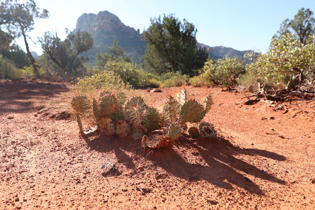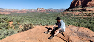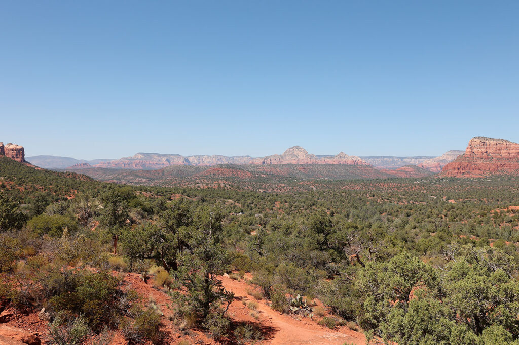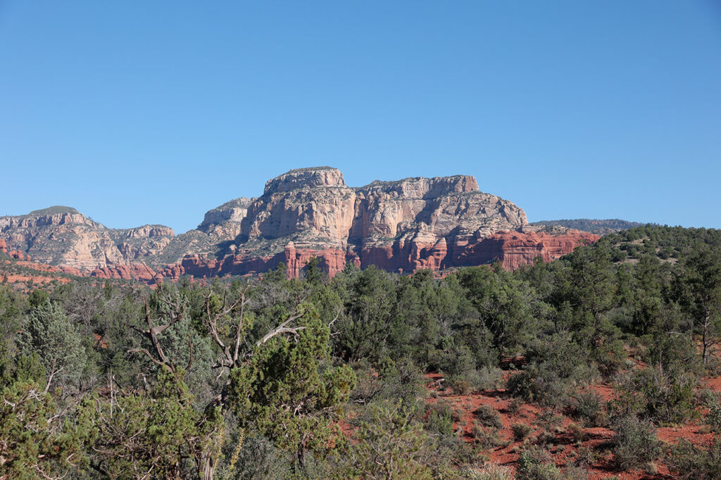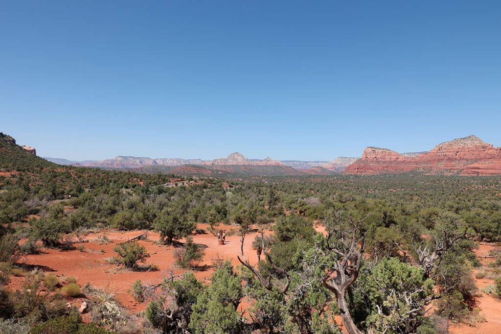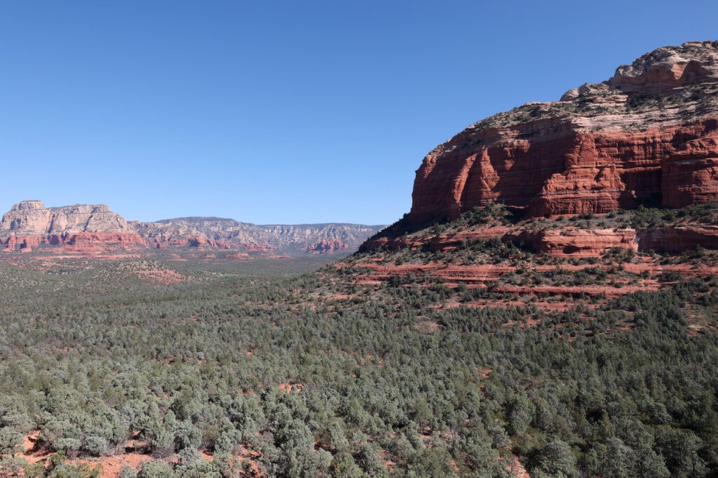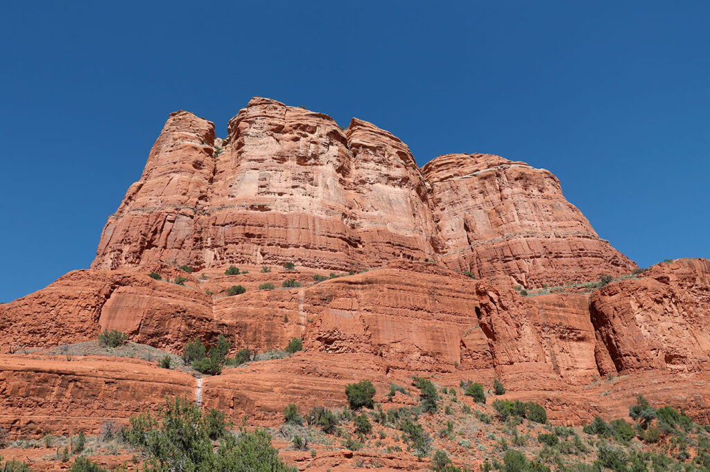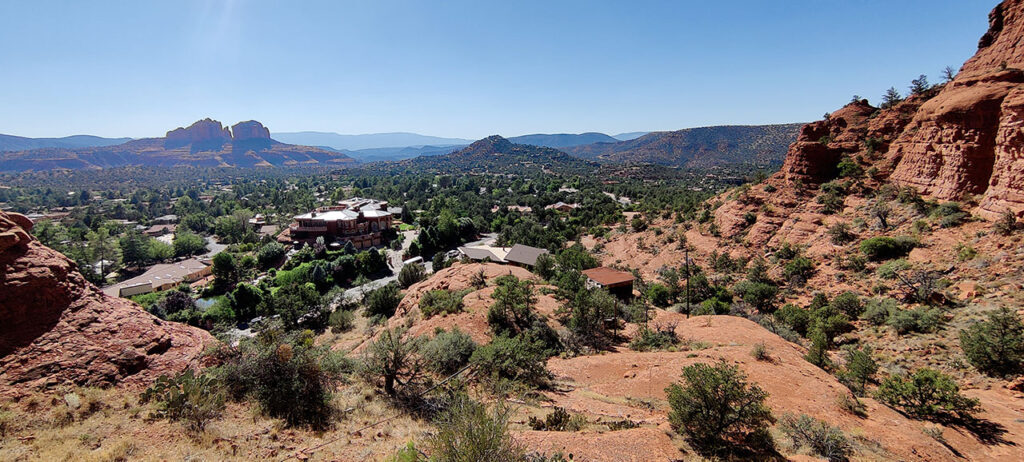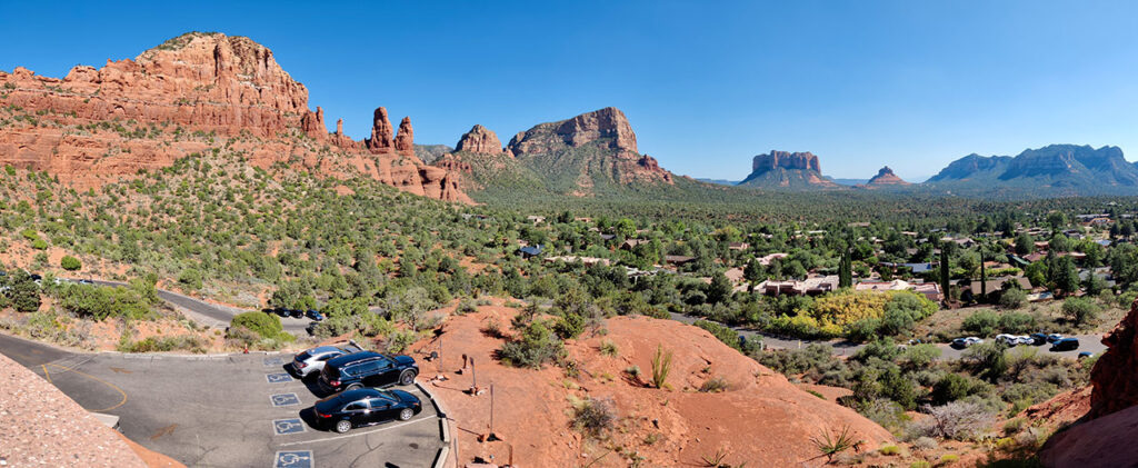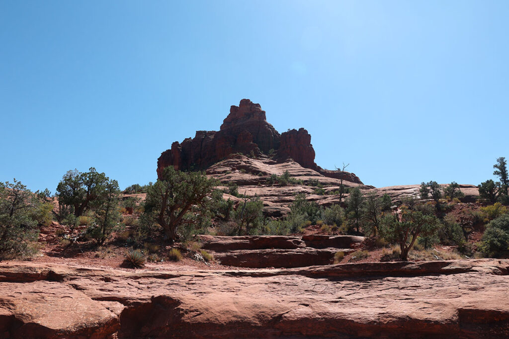 Le plan de l’après-midi était d’aller escalader Cathedral Rock, une autre curiosité géologique. Sauf qu’une fois sur place nous découvrons que le parking est fermé et qu’il faut retourner en ville pour prendre une navette. Comme ça nous enquiquine, nous passons un plan B qui se trouve un peu plus bas sur la même route. Nous escaladerons du coup Courthouse Rock. En soit ce n’est pas ce rocher là qui est intéressant mais le panorama qu’il offre une fois dessus.