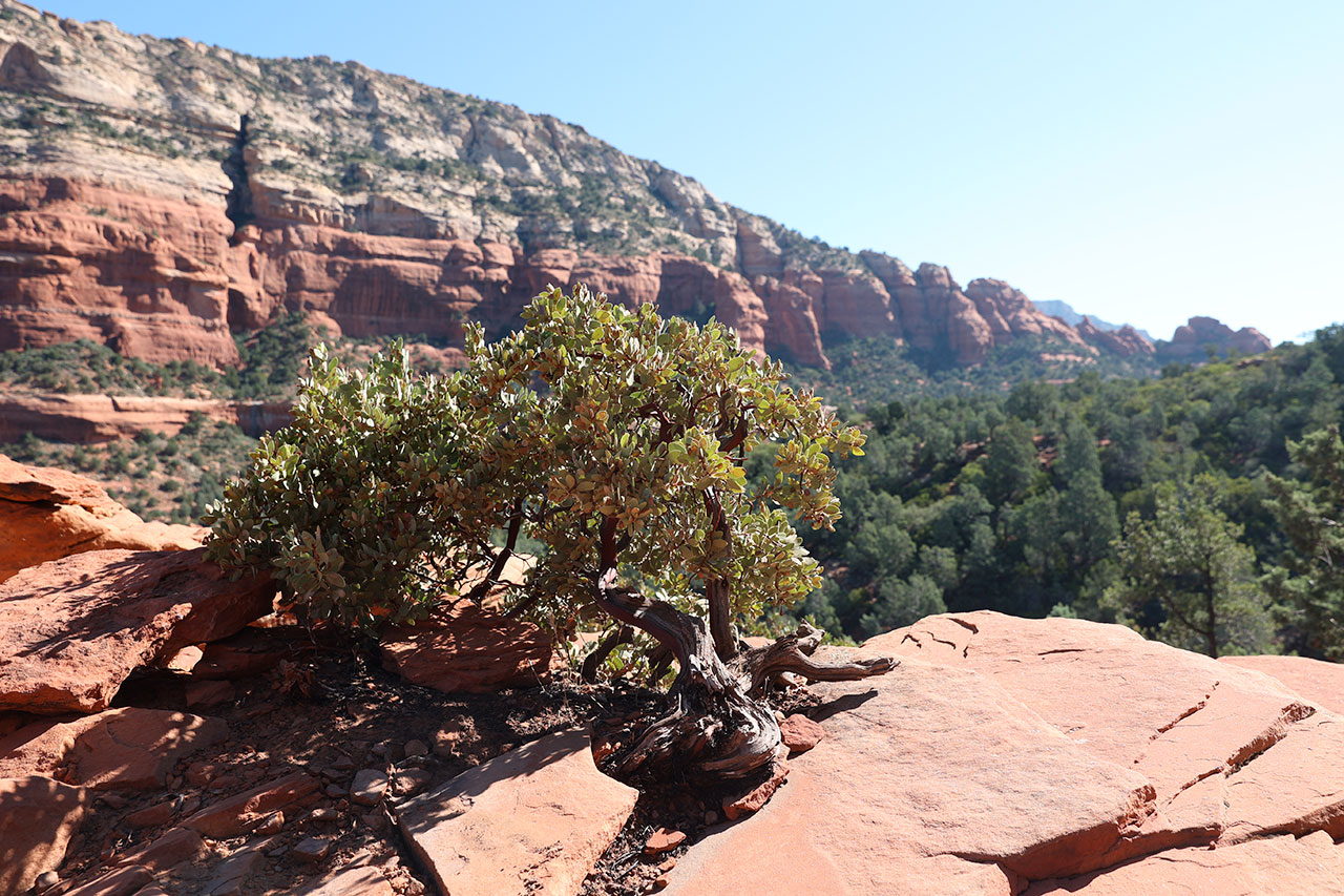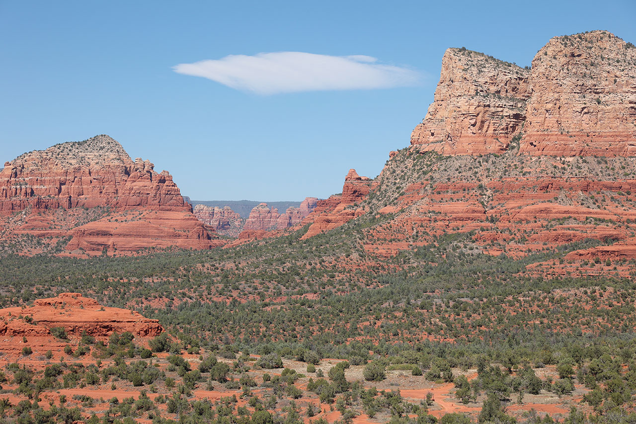Le plan de l’après-midi était d’aller escalader Cathedral Rock, une autre curiosité géologique. Sauf qu’une fois sur place nous découvrons que le parking est fermé et qu’il faut retourner en ville pour prendre une navette. Comme ça nous enquiquine, nous passons un plan B qui se trouve un peu plus bas sur la même route. Nous escaladerons du coup Courthouse Rock. En soit ce n’est pas ce rocher là qui est intéressant mais le panorama qu’il offre une fois dessus.