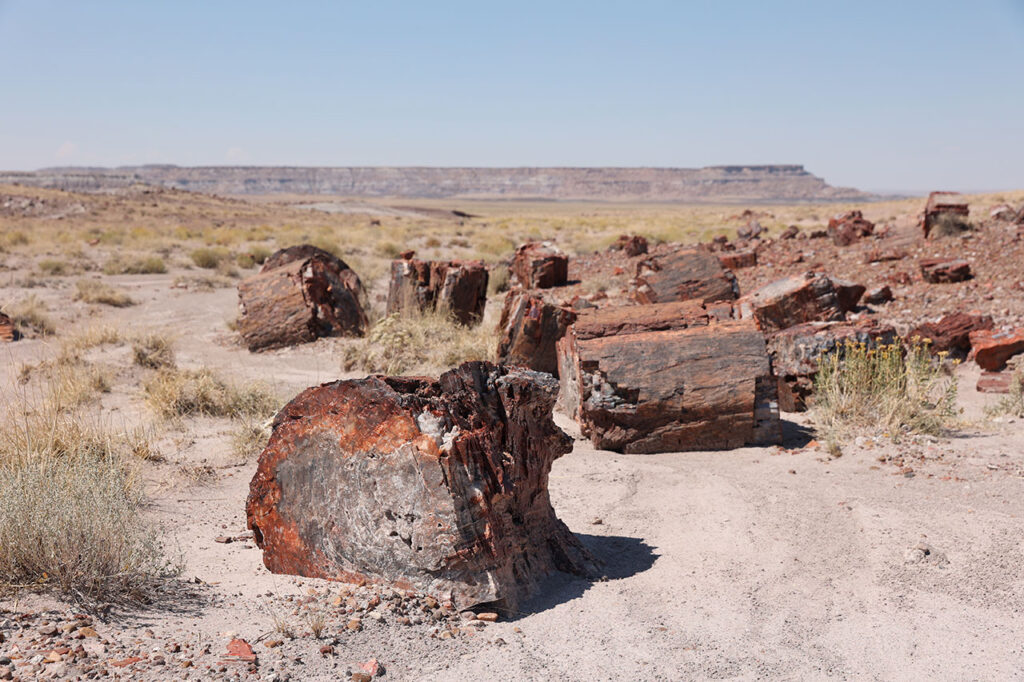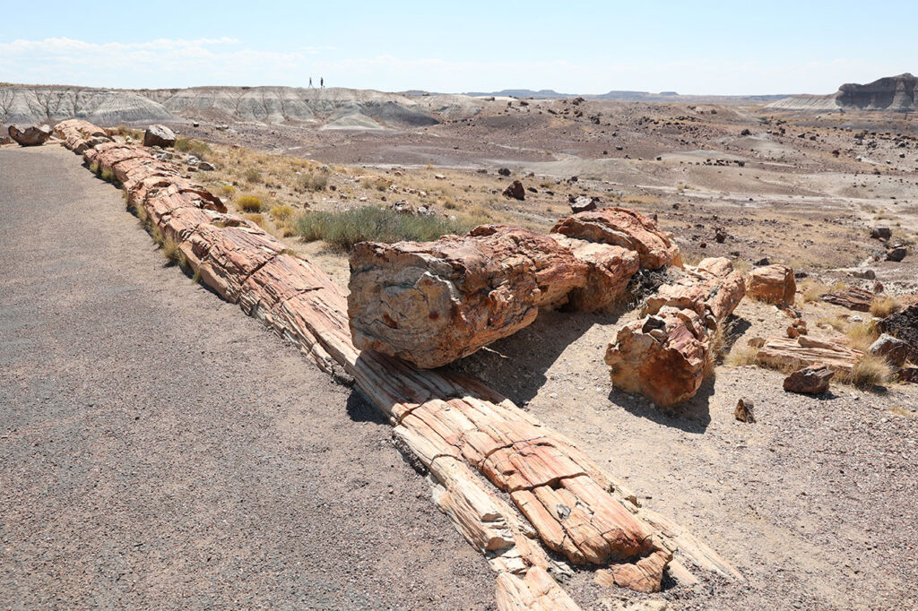 Notre première destination du jour est le Petrified Forest National Park. Une curiosité géologique au même titre que le Grand Canyon hier. On y voit (entre autre) des troncs d’arbres pétrifiés lors d’une éruption volcanique il y a 270 millions d’années et qui aujourd’hui sont de la roche tout en ayant gardé leur aspect originel. Ca plus une variété de panoramas assez fou. Avoir ce paysage digne de Mars en premier plan et en fond la prairie de l’Arizona est quelque chose d’assez sublime.