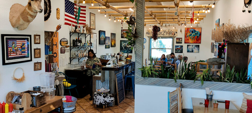 Pareil, plus typique, ce n’est pas possible. Les banquettes, la serveuse qui vous resserre du café à volonté, les habitués, les drapeaux US partout, la télé allumée sur Fox News (en Arizona on vote Républicain donc on regarde Fox News) et le clou du spectacle. Un monsieur d’environ 75 ans, avec son chapeau hors d’âge, sa chemise rayée, son petit gilet, son accent à couper à la tronçonneuse, sa tasse Trump, la cartouchière autour de la taille et évidemment le revolver qui va avec. Ca ne s’invente pas.
