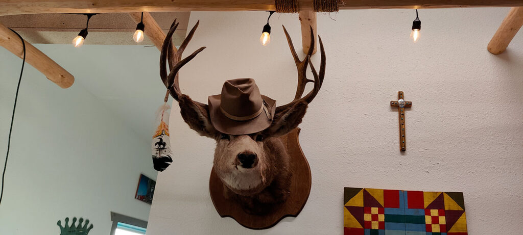 Il fait déjà nuit mais des clients arrivent encore, la plupart sont des chasseurs. En effet, c’est la saison de la chasse dans l’état. Chasse à l’arc pour l’instant, la chasse au fusil n’ouvre que début octobre. Nous comprenons que nous avons eu de la chance d’avoir une chambre car l’endroit est très prisé pour la chasse aux wapitis. J’en ai d’ailleurs aperçu en bord de route, le bestiau est massif. Bref, notre voisin débarque avec un énorme pickup Dodge. Comme nous discutions avec la gérante, il s’excuse de nous avoir interrompu. Là-dessus démarre une autre conversation tout aussi improbable. Nous parlerons aussi bien de son camp de chasse dans les montagnes, que des distances de voyage (il vient de Huntsville au Texas – 14 heures de route), de la consommation de son pickup (où il me dit dans un éclat de rire qu’il aurait moins consommé si il avait roulé moins vite avec sa remorque), des normes antipollutions en Europe, du prix de son pickup en France ou encore du fait de vouloir écraser les gens dans les rues de Paris avec son Dodge. Du grand n’importe quoi. C’est aussi ce qui fait le charme de ce pays, des conversations improbables avec des inconnus.
