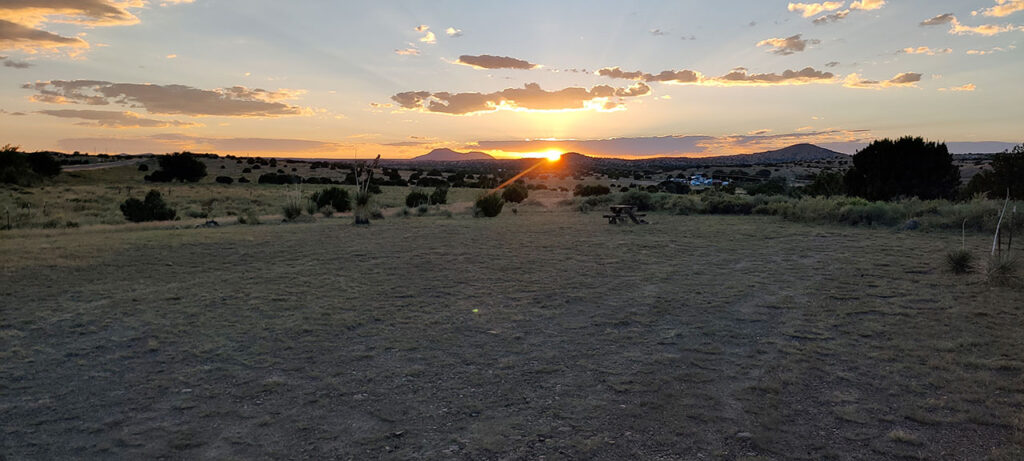 Nous passons la frontière du Nouveau-Mexique, ce qui fait que j’ai officiellement visité 27 états sur 50. Aurélie en est à 6 (pour l’instant). En passant la frontière, nous avons aussi changé d’heure. Hé oui. De 9h de décalage avec la France, nous sommes passés à 8. Je vais aussi en profiter pour rectifier ce que j’ai dit à propos du point le plus haut du voyage. Hier 2200 mètres d’altitude, aujourd’hui 2370 mètres. Quant aux paysages du Nouveau-Mexique, c’est très très différent de ce à quoi je m’attendais. Je pensais voir quelque chose ressemblant aux alentour de Phoenix, du désert bien rocheux avec des cactus. En fait non. C’est très vert et montagneux et c’est absolument splendide. Cet état gagne à être connu.