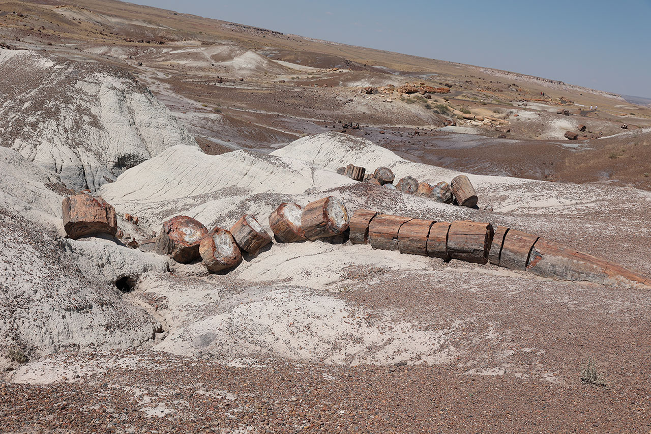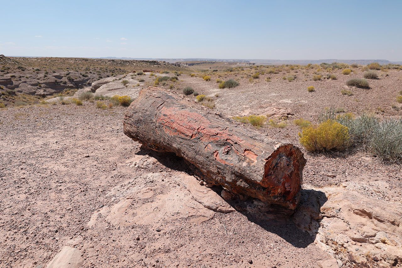 Notre première destination du jour est le Petrified Forest National Park. Une curiosité géologique au même titre que le Grand Canyon hier. On y voit (entre autre) des troncs d’arbres pétrifiés lors d’une éruption volcanique il y a 270 millions d’années et qui aujourd’hui sont de la roche tout en ayant gardé leur aspect originel. Ca plus une variété de panoramas assez fou. Avoir ce paysage digne de Mars en premier plan et en fond la prairie de l’Arizona est quelque chose d’assez sublime.