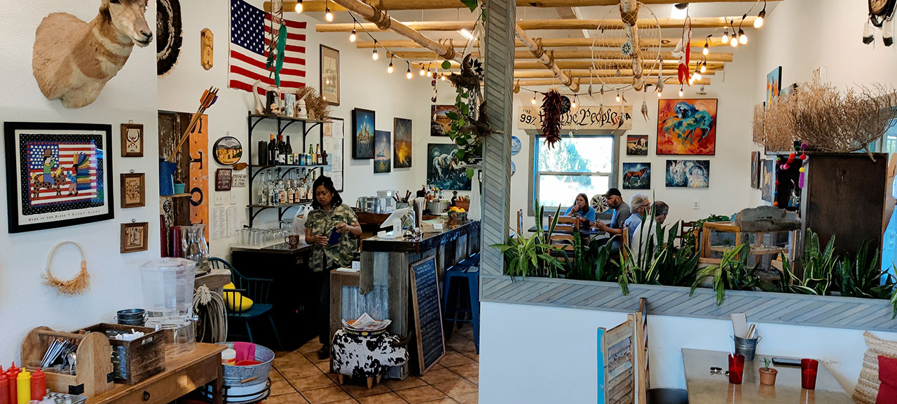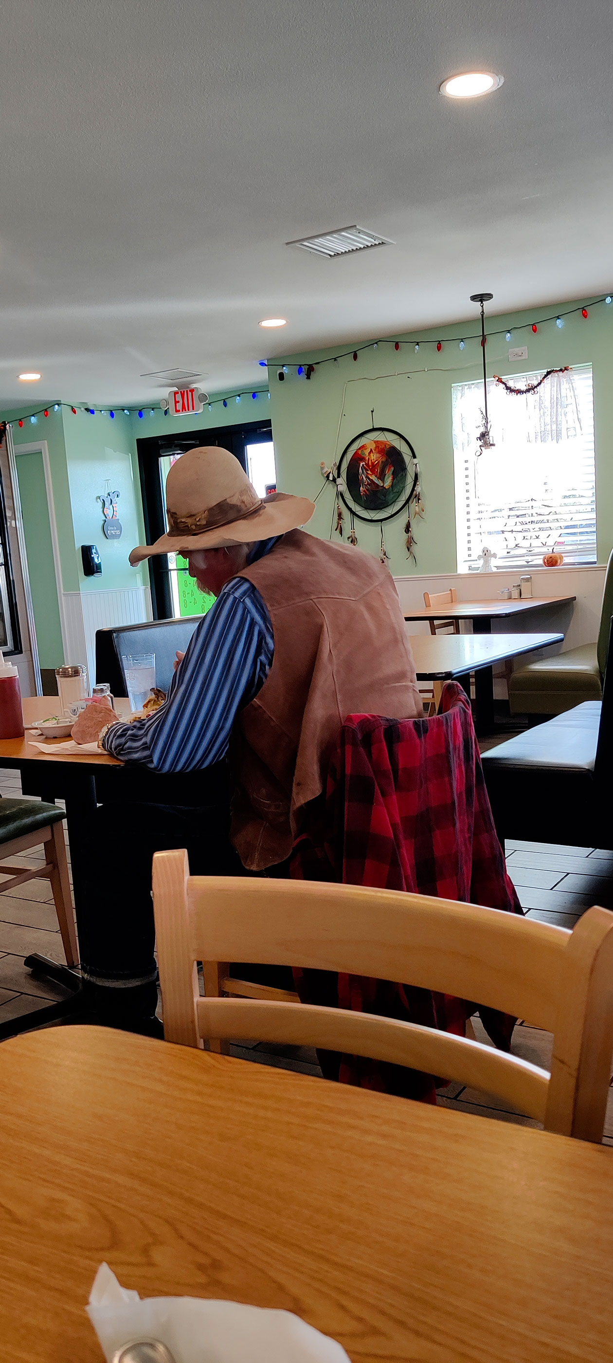 Pareil, plus typique, ce n’est pas possible. Les banquettes, la serveuse qui vous resserre du café à volonté, les habitués, les drapeaux US partout, la télé allumée sur Fox News (en Arizona on vote Républicain donc on regarde Fox News) et le clou du spectacle. Un monsieur d’environ 75 ans, avec son chapeau hors d’âge, sa chemise rayée, son petit gilet, son accent à couper à la tronçonneuse, sa tasse Trump, la cartouchière autour de la taille et évidemment le revolver qui va avec. Ca ne s’invente pas.