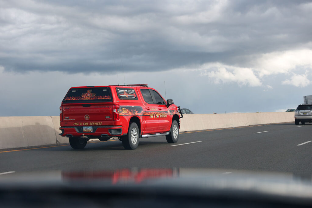 L’heure tournant et les distances étant débiles dans ce pays, nous décidons de repartir pour tenter aller voir la rivière Chama comme initialement prévu. Sauf que 10 kilomètres après la sortie de Taos, la tableau de bord de la voiture se transforme en arbre de noël. Allons bon… pression de pneu faible à l’arrière gauche. En jouant avec les différentes écrans de la voiture, j’avais déjà remarqué sur celui affichant la pression des pneus que l’arrière gauche était sous gonflé par rapport aux autres. Là la pression est tombé très fort d’un coup. Prudent, nous stoppons pour une inspection visuelle du pneu. Rien à signaler. Peut-être est-ce la sonde qui se tape une phase? Dans le doute nous faisons demi tour pour trouver une station service à Taos et refaire la pression. Puis nous repartons, Aurélie décidant de prendre le volant.