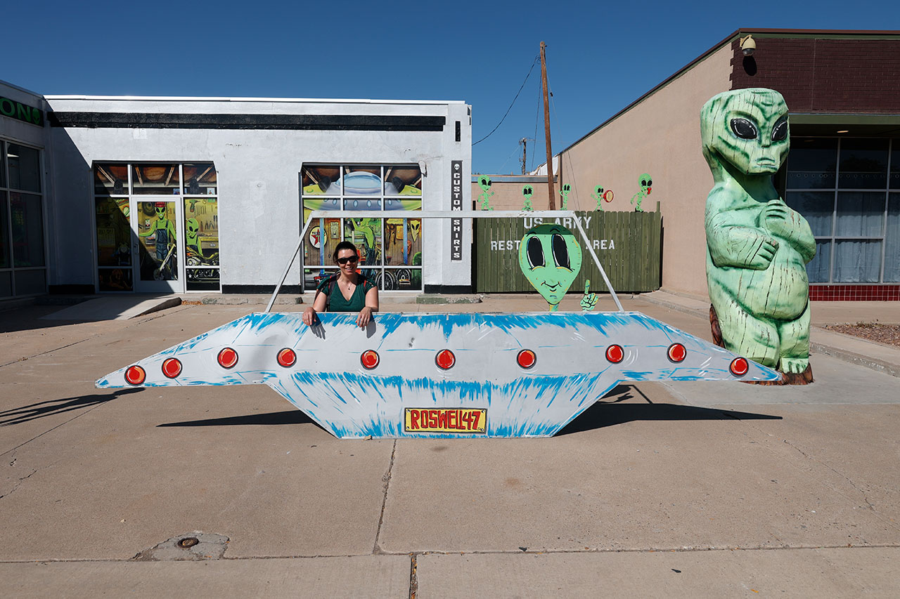 Là-dessus nous repartons au travers des montagnes du Nouveau-Mexique jusqu’à Roswell. En soit, passer par Roswell nous fait faire un détour d’une vingtaine de kilomètres mais sur 900+ c’est négligeable. Et puis nous ne passons pas tous les jours dans le coin donc allons-y!