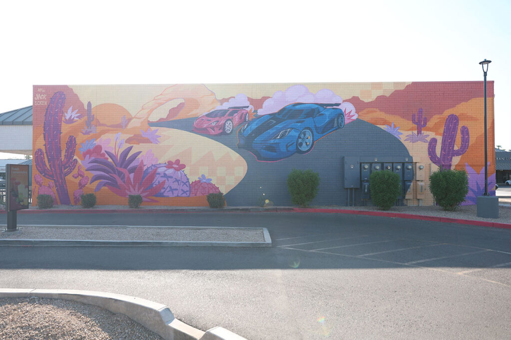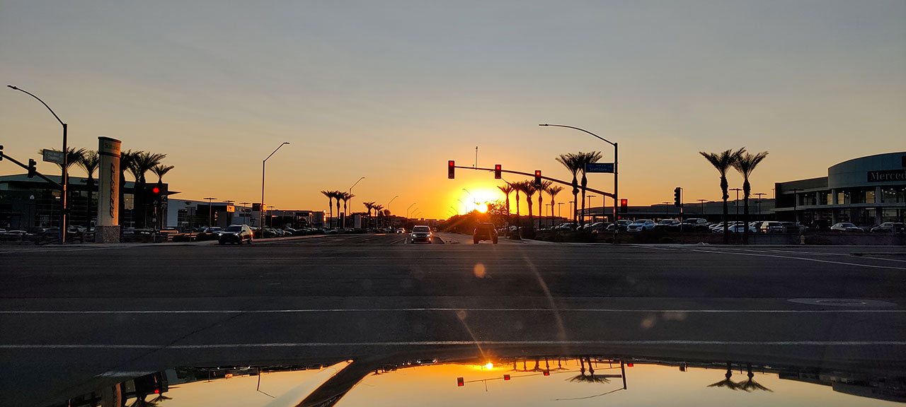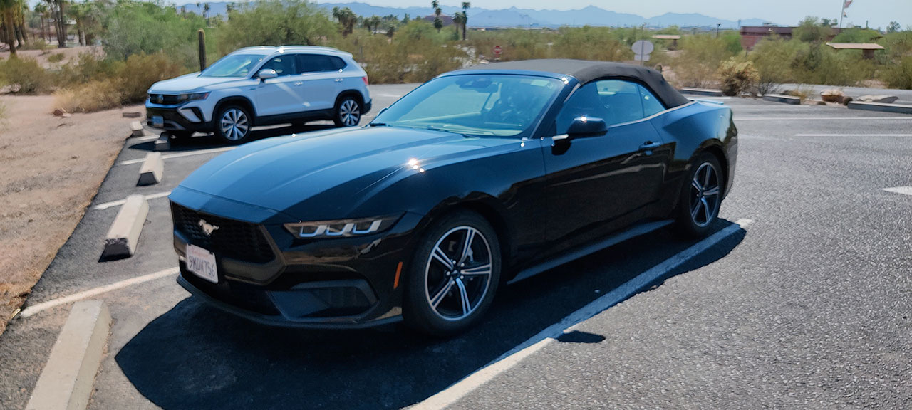 Du coup, nous nous en sommes tenus au plan de départ: Mustang cabriolet juste « parce que ». Sauf que voila, qui dit cabriolet, dit coffre plus petit à cause du toit rétractable et bien entendu, on ne peut pas mettre les 2 valises dans le coffre. Je dois donc glisser la mienne derrière mon siège. J’aurais pris mon sac de voyage habituel, pas de problème mais y’a fallu que pour une fois je prenne une valise rigide. Bref. Autre problème du cabriolet. Quand il fait 43°, rouler toit baissé en plein soleil est une fausse bonne idée. C’est intenable plus de 5 minutes. Pour la petite histoire, ici à Phoenix ils en sont à 107 jours consécutifs où la température ne descend pas en dessous de 40° en journée et 30° la nuit. Normalement, les températures devraient être un peu plus supportable là où nous allons.