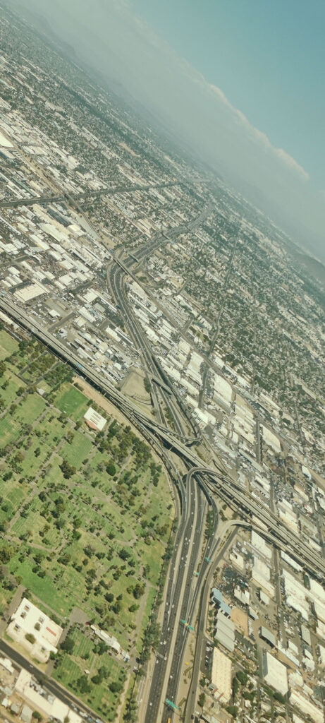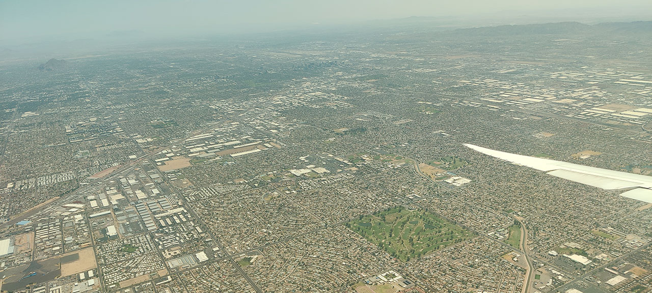 Sur les photos de Phoenix prises depuis l’avion, l’espèce de brume n’est pas las pollution mais les fumées des feux de forêt en Californie qui sont portées jusqu’ici par les vents.