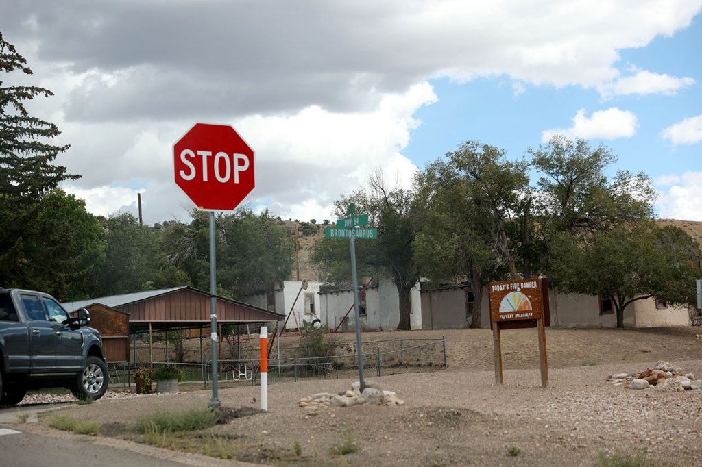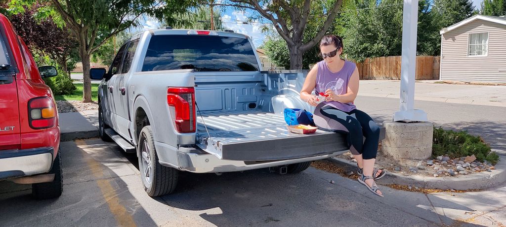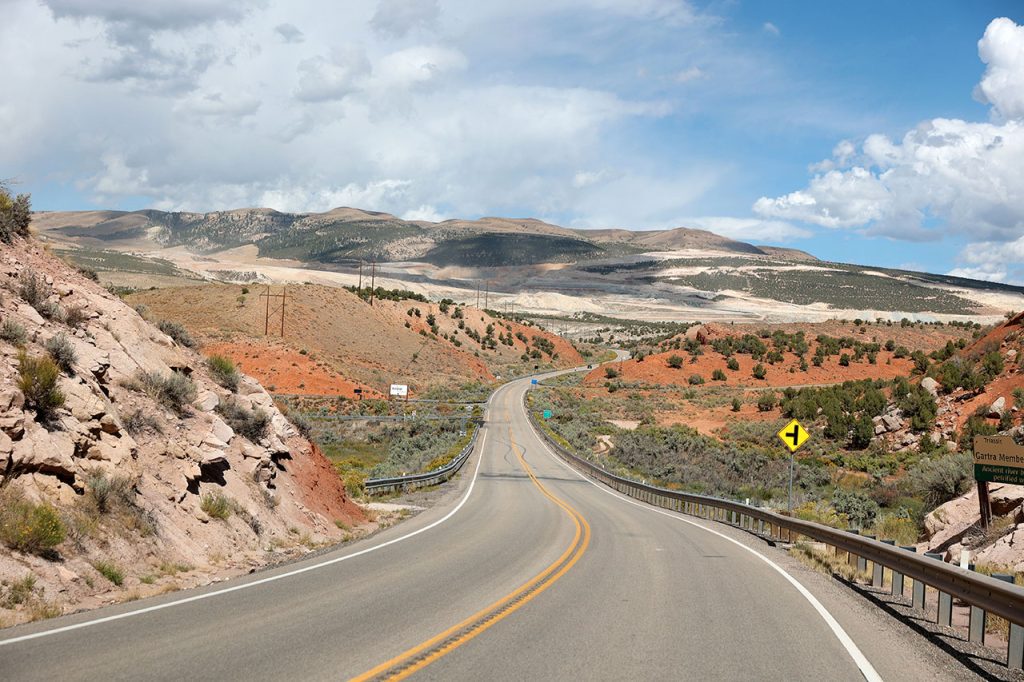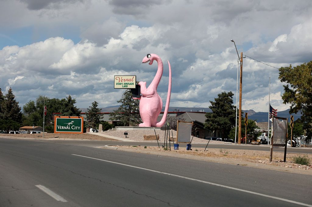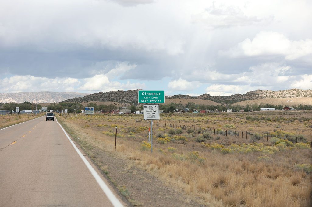 Aurélie prend le volant pour les 3 dernières heures de route. Nous piquerons un fou rire quand en arrivant dans la ville de Dinosaur (OUI c’est le nom de la ville), le GPS nous dira de quitter Stegosaurus Road pour tourner à gauche sur Brontausaurus Boulevard. Véridique. La suite sera un peu moins fun. Beaucoup de route de sinueuse avec de la dénivellation. Il y aura quelques jolis points de vue mais globalement, ce ne sera pas la folie. Pour couronner le tout, nous resterons un bon moment derrière un camion qu’il sera quasi impossible de doubler pendant près de 30 kilomètres. Route fatigante donc, Aurélie sera rincée en arrivant au motel.