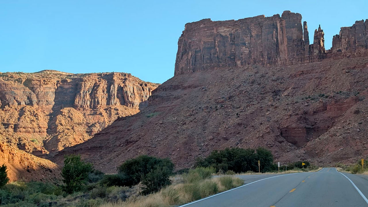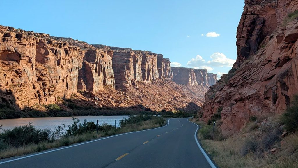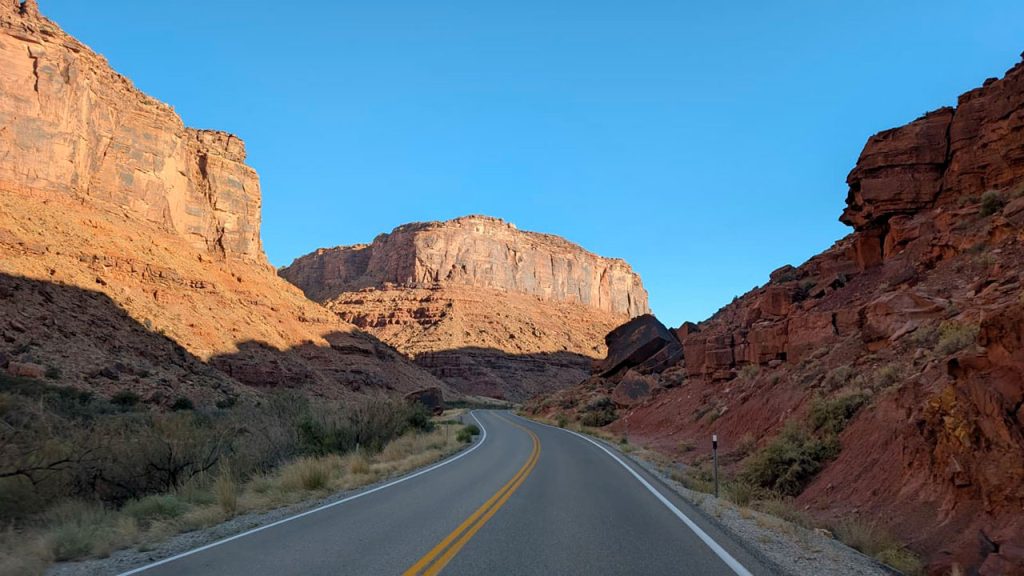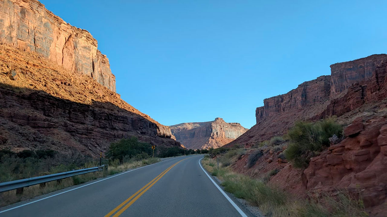 Hier nous avons abandonné l’idée de sortir du parc de Canyonlands pour venir rouler au bord du fleuve Colorado par manque de temps. Ce matin, notre trajet nous propose 2 options. La grosse route à 4 voies ou bien celle qui suit le fleuve sur 50 kilomètres pour juste un allongement de temps de trajet de 4 minutes. A votre avis, par où sommes-nous passé?
